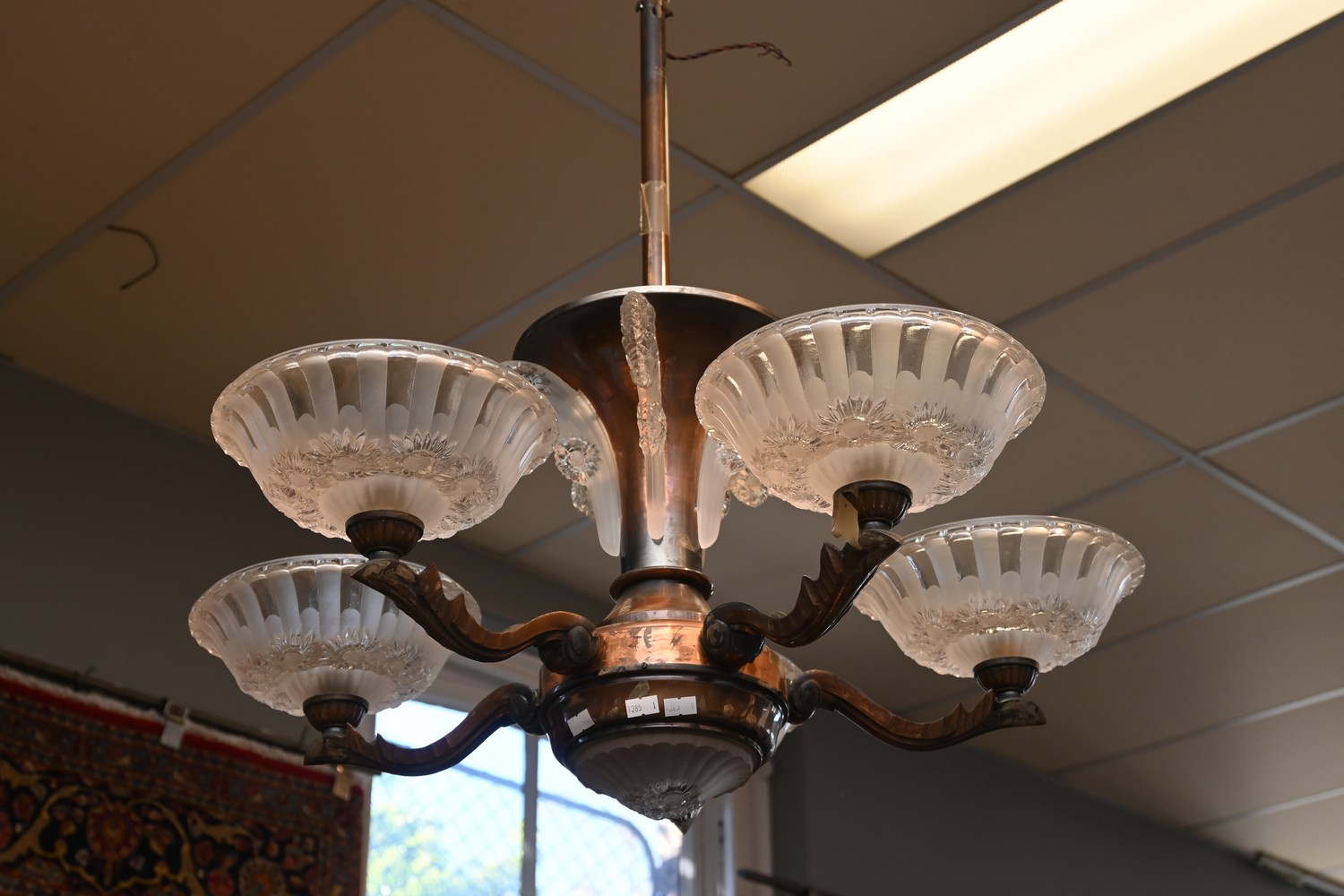 A FRENCH ART DECO FIVE BRANCH COPPER AND MOULDED GLASS CHANDELIER SIGNED EZAN CIRCA 1930 (72H X 72D CM) (LEONARD JOEL DELIVERY SIZE: LARGE)