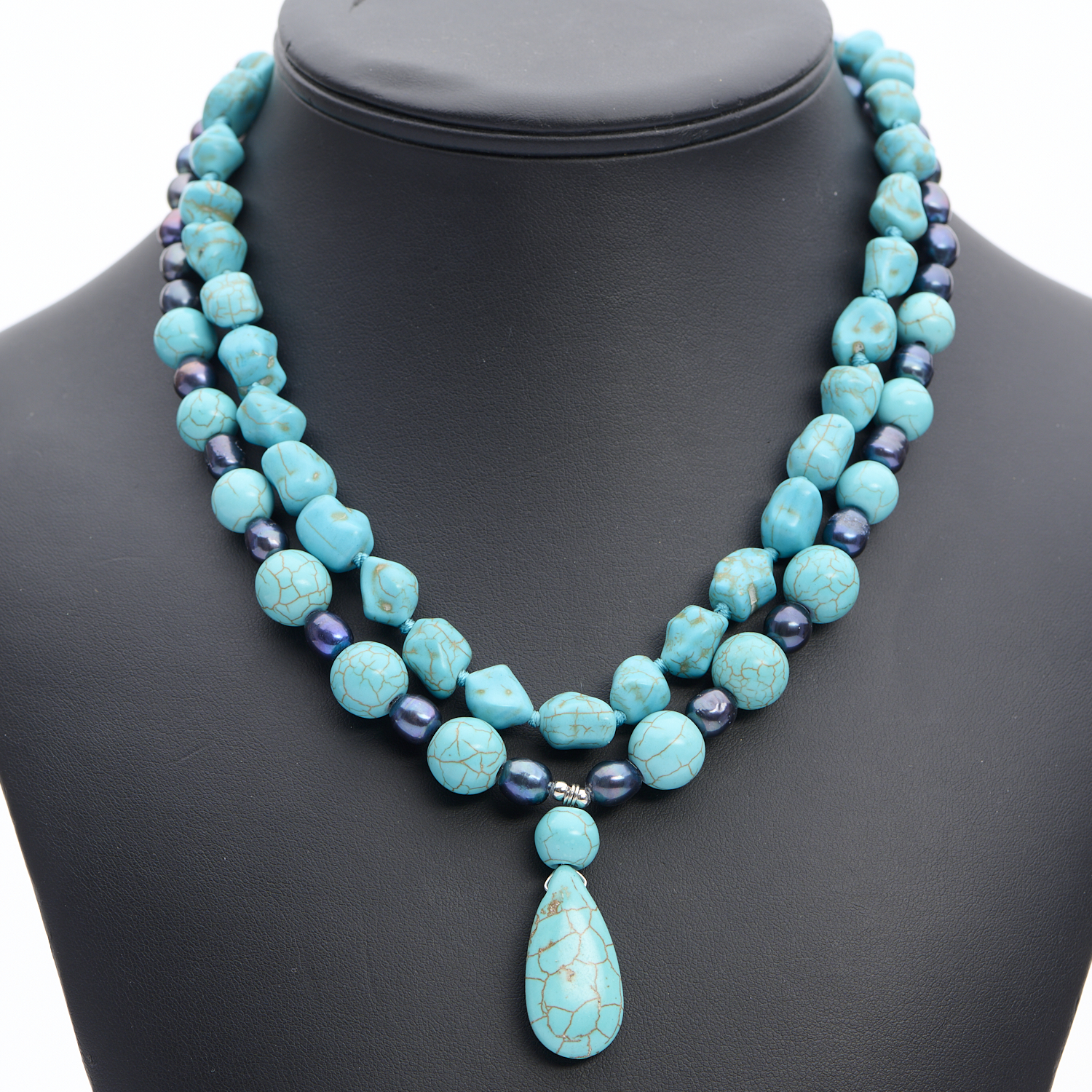 A STRAND OF DYED HOWLITE AND FRESHWATER PEARLS, ALONG WITH A SECOND STRAND OF DYED HOWLITE BEADS, LENGTHS APPROXIMATELY 460 AND 485MM