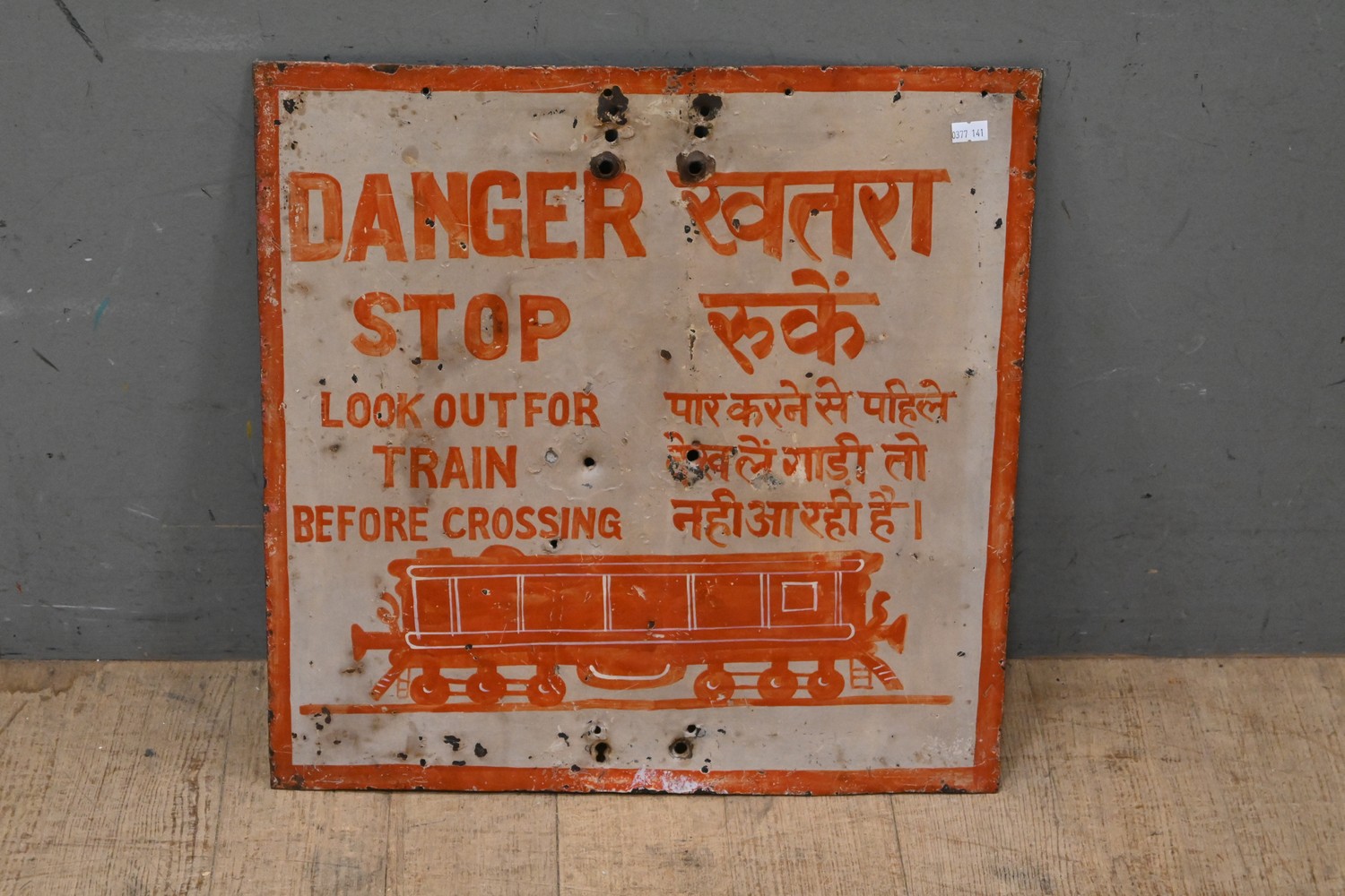 A HAND PAINTED METAL INDIAN TRAIN CROSSING SIGN (46H X 46W CM) (LEONARD JOEL DELIVERY SIZE: MEDIUM)