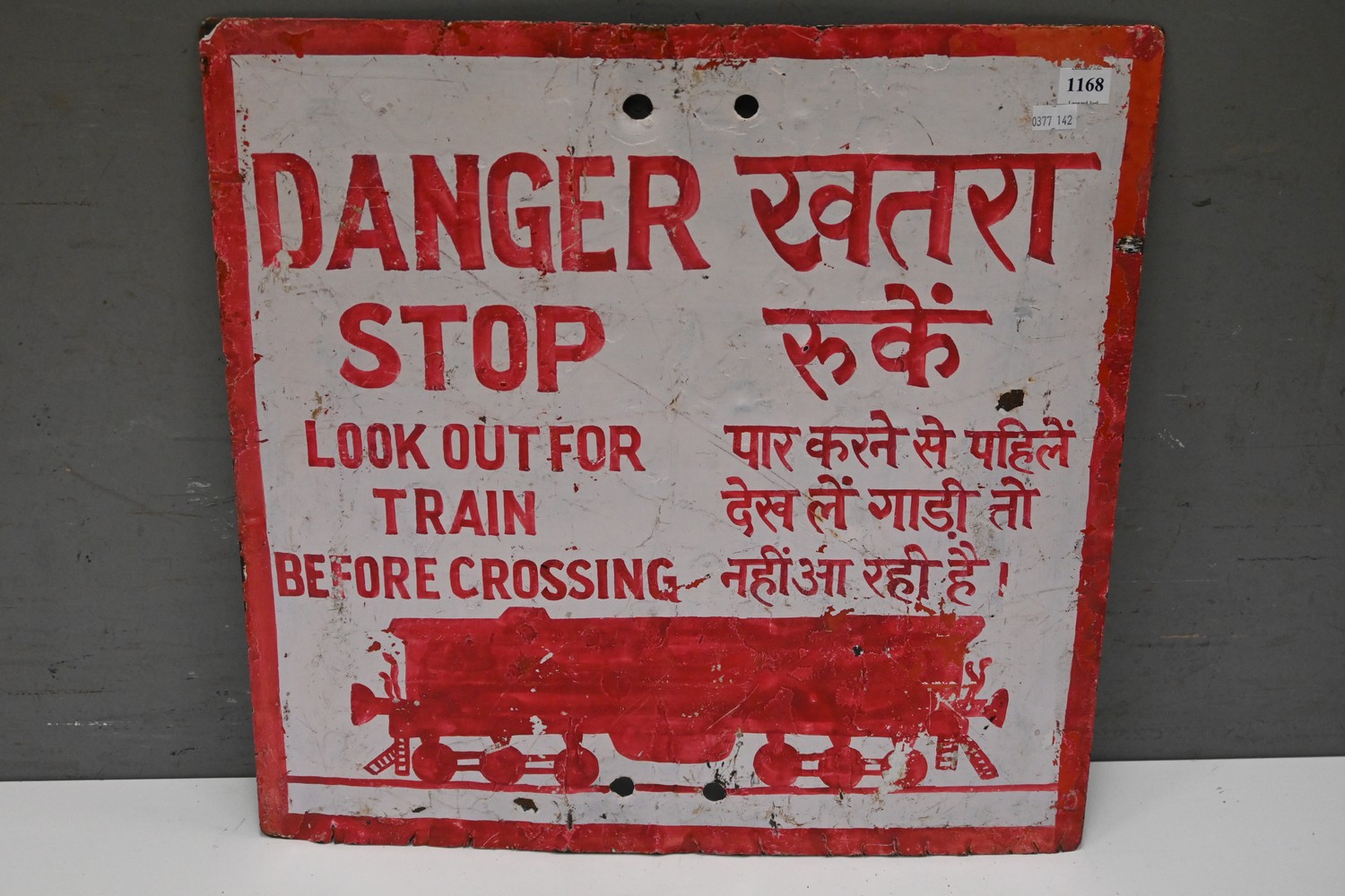 A 1920S HAND PAINTED METAL INDIAN TRAIN CROSSING SIGN (45H X 45W CM) (LEONARD JOEL DELIVERY SIZE: MEDIUM)