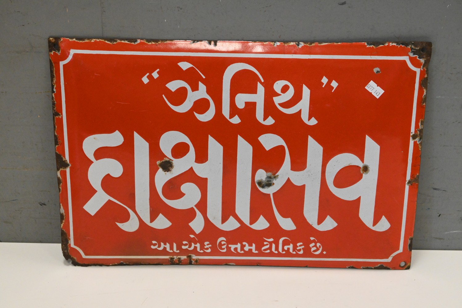 A RED AND WHITE RECTANGULAR INDIAN ENAMEL SIGN (33H X 47W CM) (LEONARD JOEL DELIVERY SIZE: MEDIUM)