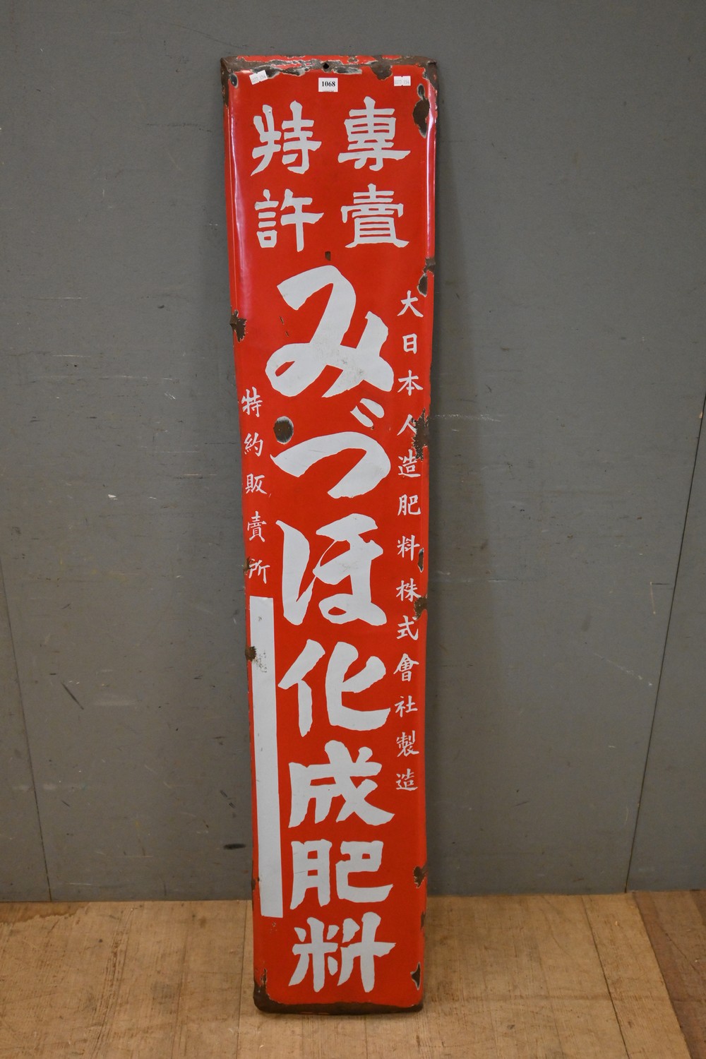 LARGE 1940S RECTANGULAR JAPANESE ENAMEL ADVERTISING SIGN - RED GROUND WHITE WRITING (152H X 29W CM) (LEONARD JOEL DELIVERY SIZE: LARGE)