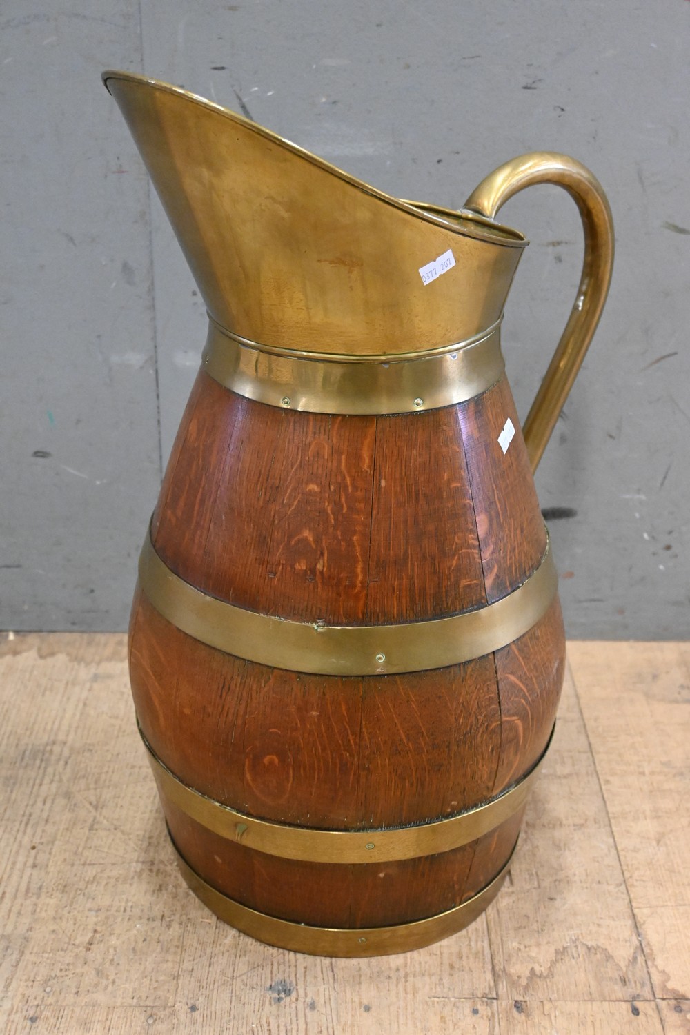 A FRENCH COOPERED OAK AND BRASS BOUND TAVERN JUG IN WONDERFUL CONDITION (58H CM) (LEONARD JOEL DELIVERY SIZE: LARGE)