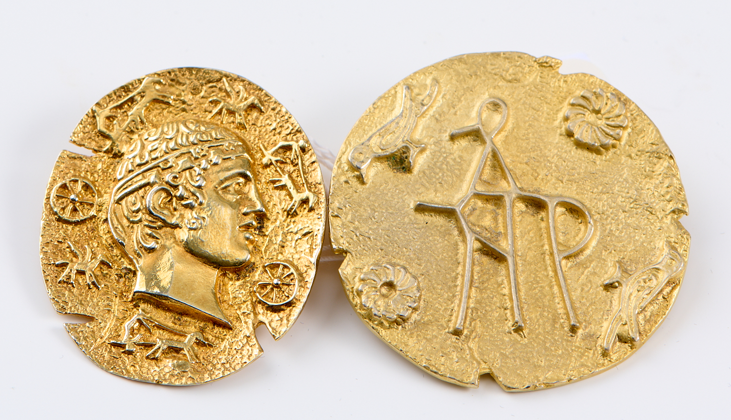 TWO GREEK REVIVAL BROOCHES IN SILVER GILT, MEASURING 39MM IN DIAMETER AND 37 X 30MM