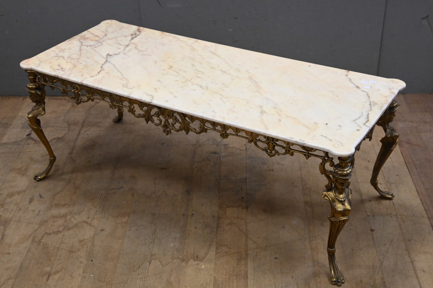 A DECORATIVE BRASS COFFEE TABLE WITH MARBLE TOP ( 48H X 127W X 53D CM) (PLEASE NOTE THIS HEAVY ITEM MUST BE REMOVED BY CARRIERS AT THE CUSTOMER'S EXPENSE. LEONARD JOEL STAFF CANNOT ASSIST CARRYING THIS ITEM) (X-LARGE ITEM)