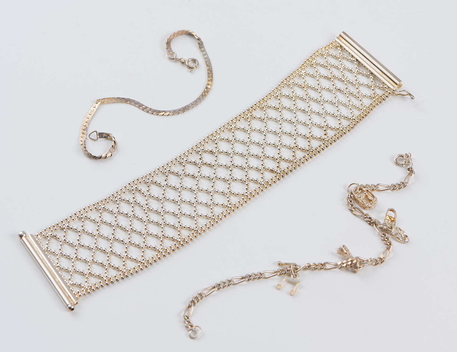 THREE BRACELETS IN STERLING SILVER, COMPRISING AN ITALIAN MESH BALL BRACELET (LENGTH 190MM), AFLAT CURB LINK BRACELET (LENGTH 190MM), AND A CHARM BRACELET (LENGTH 190MM)