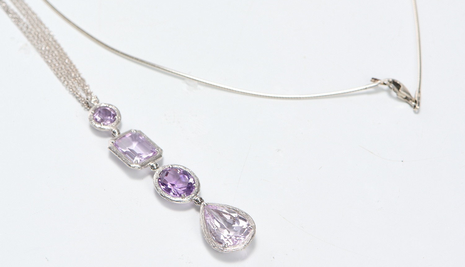 AN AMETHYST AND DIAMOND DROP PENDANT TO A CHAIN IN 18CT WHITE GOLD (5.2GMS), ALONG WITH AN OPTIONAL OMEGA CHAIN IN STERLING SILVER