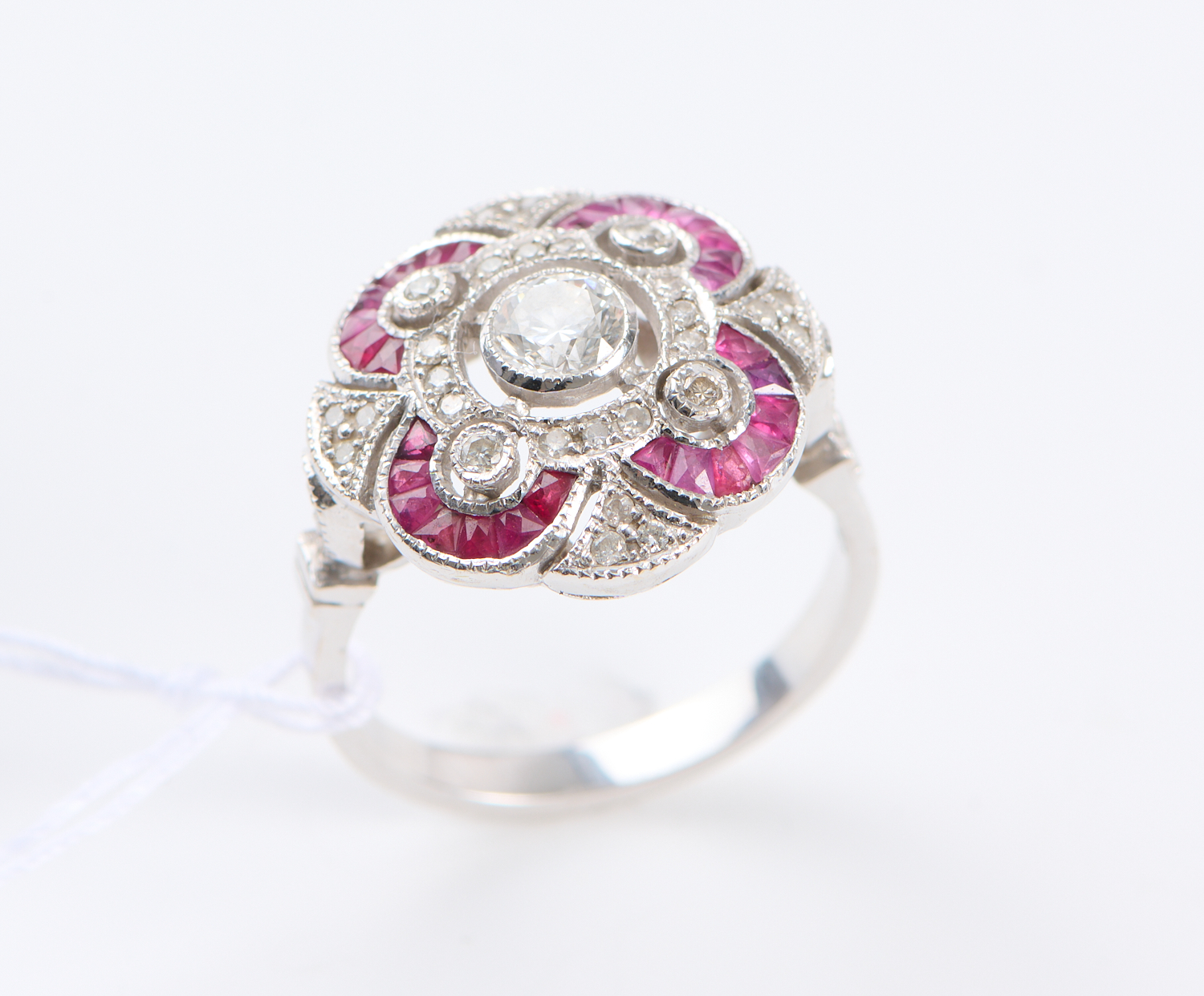 A RUBY AND DIAMOND DRESS RING IN 18CT WHITE GOLD, RING SIZE N, 5.74GMS