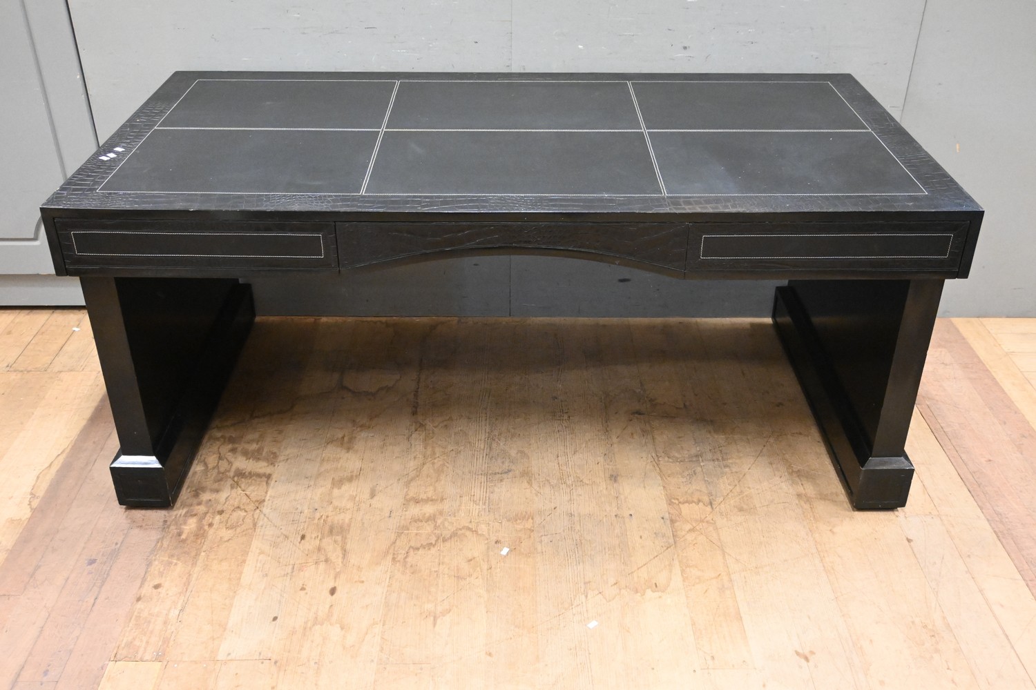 A CONTEMPORARY LEATHER DESK (79H X 183W X 92D CM) (PLEASE NOTE THIS HEAVY ITEM MUST BE REMOVED BY CARRIERS AT THE CUSTOMER'S EXPENSE. LEONARD JOEL STAFF CANNOT ASSIST CARRYING THIS ITEM) (X-LARGE ITEM)