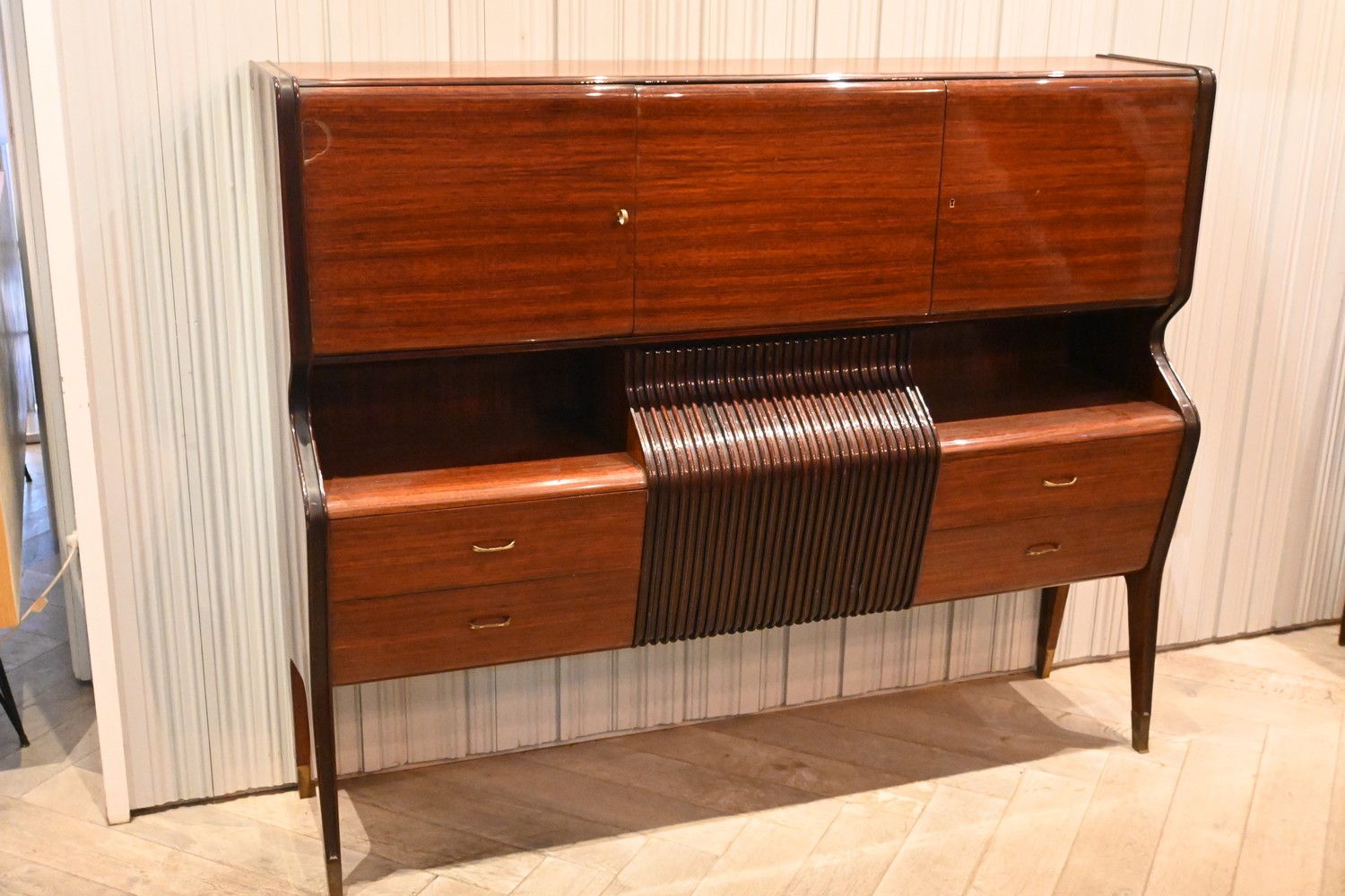 MID CENTURY ITALIAN COCKTAIL CABINET BY OSVLADO BORSANI, C.1950'S WITH KEY (A/F) (H146 X W179 X D94 CM) (PLEASE NOTE THIS HEAVY ITEM MUST BE REMOVED BY CARRIERS AT THE CUSTOMER'S EXPENSE. LEONARD JOEL STAFF CANNOT ASSIST CARRYING THIS ITEM) (X-LARGE ITEM)