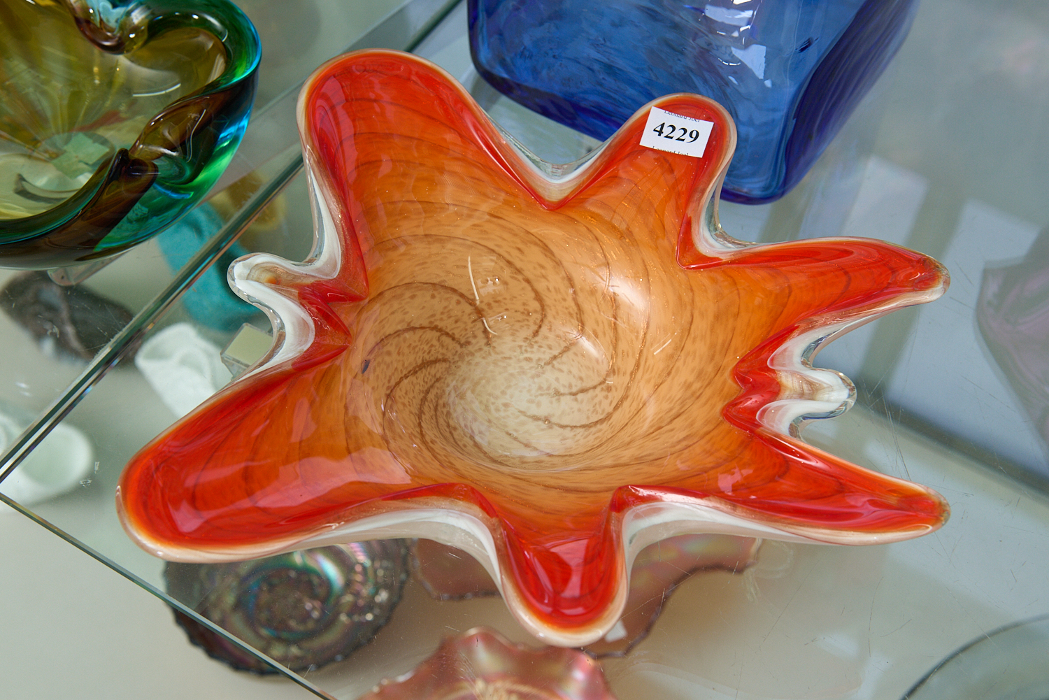 AN ORANGE AND GOLD FOIL INCLUSION GLASS BOWL W.31CM, LEONARD JOEL LOCAL DELIVERY SIZE: SMALL