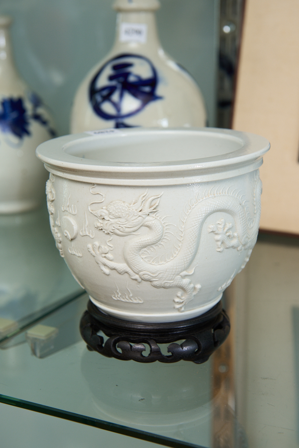A CHINESE WHITE FIVE CLAW IMPERIAL DRAGON DECORATED PLANTER WITH IMPRESSED CHINESE SEAL TO BASE ON WOODEN STAND, DIA.16CM, LEONARD JOEL LOCAL DELIVERY SIZE: SMALL