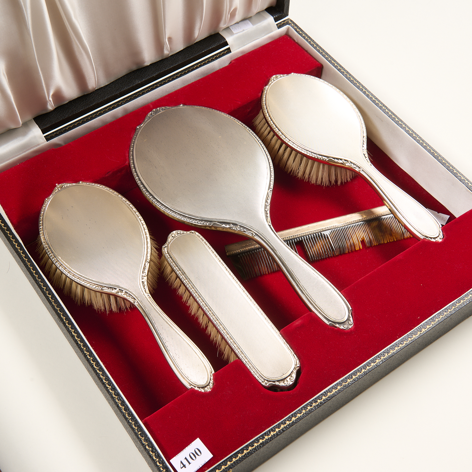 A CASED W DRUMMOND FOUR PIECE STERLING SILVER DRESSING TABLE SET (A/F TO COMB), LEONARD JOEL LOCAL DELIVERY SIZE: MEDIUM