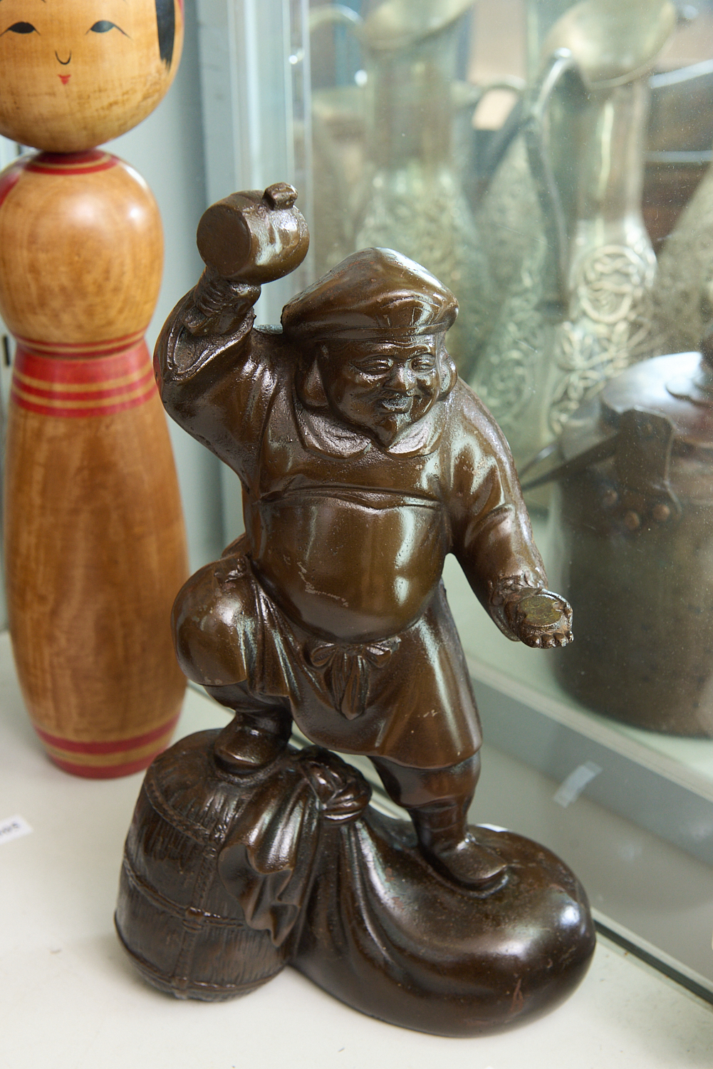 A BRONZED CAST IRON BUDDHA FIGURE WITH MALLET AND COIN H.37.5CM, LEONARD JOEL LOCAL DELIVERY SIZE: MEDIUM