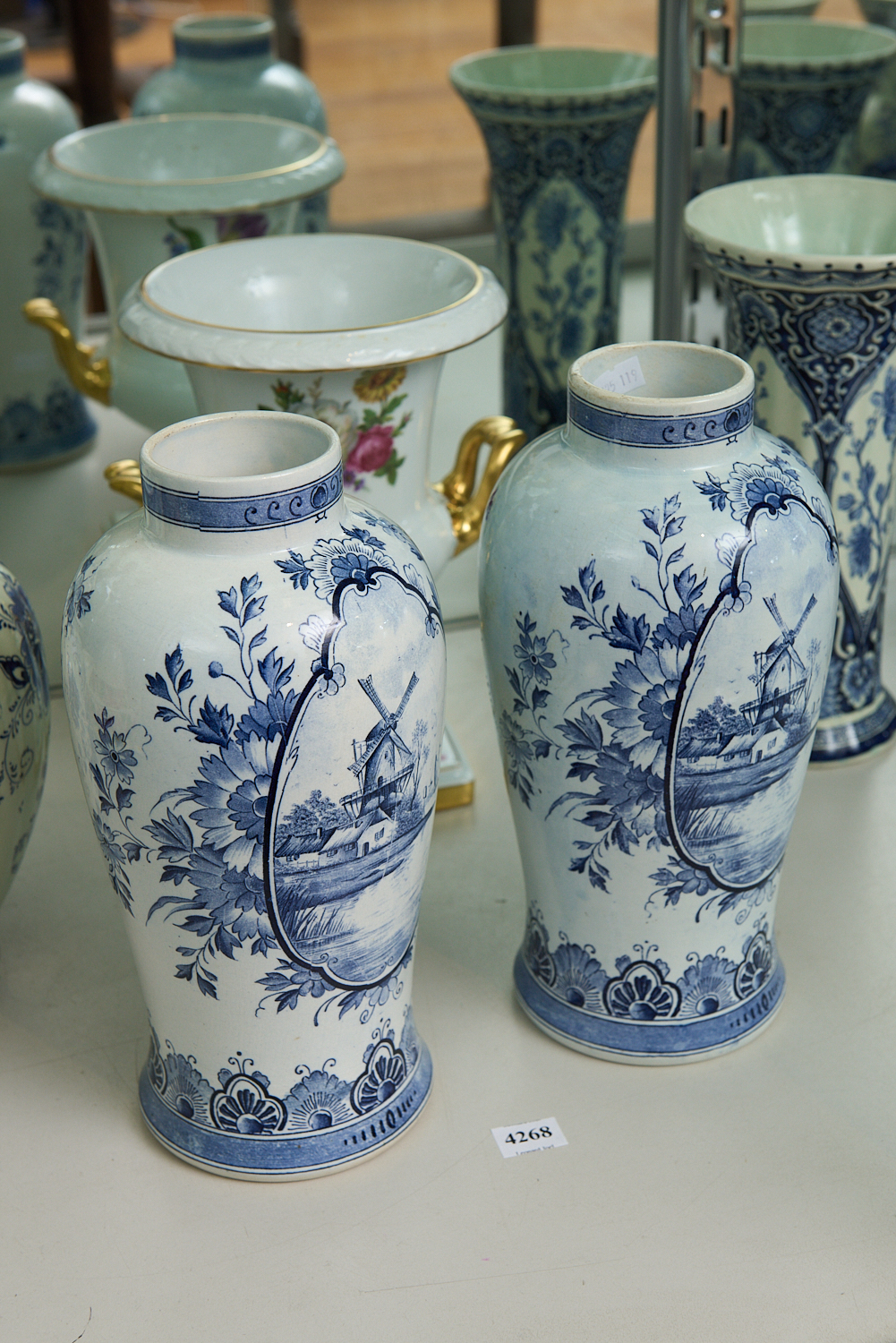 A PAIR OF DUTCH DELFT BLUE AND WHITE WINDMILL DECORATED BALUSTER VASES H.28CM, LEONARD JOEL LOCAL DELIVERY SIZE: MEDIUM
