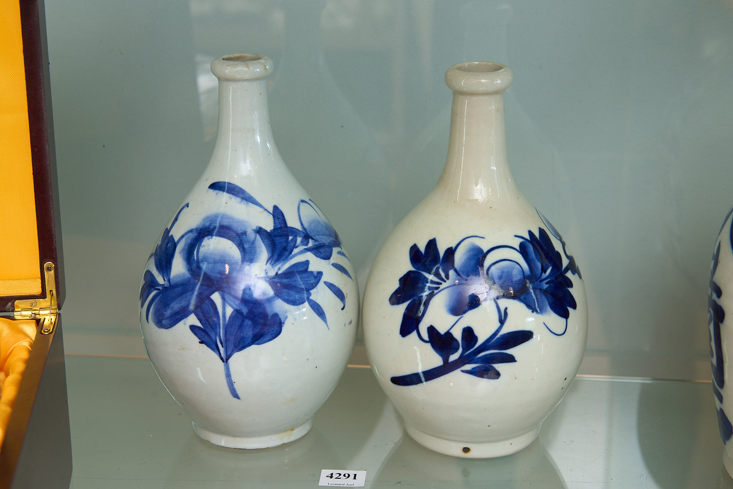 TWO JAPANESE BLUE AND WHITE GLAZED POTTERY SAKI BOTTLES H.23CM, LEONARD JOEL LOCAL DELIVERY SIZE: MEDIUM