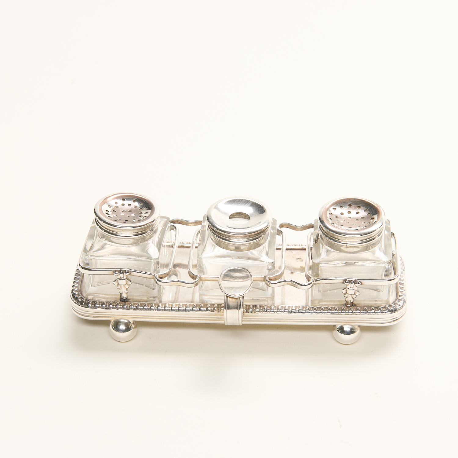 AN ENGLISH SILVER PLATED STAND WITH INKWELL AND POUNCE POT W.18CM, LEONARD JOEL LOCAL DELIVERY SIZE: SMALL
