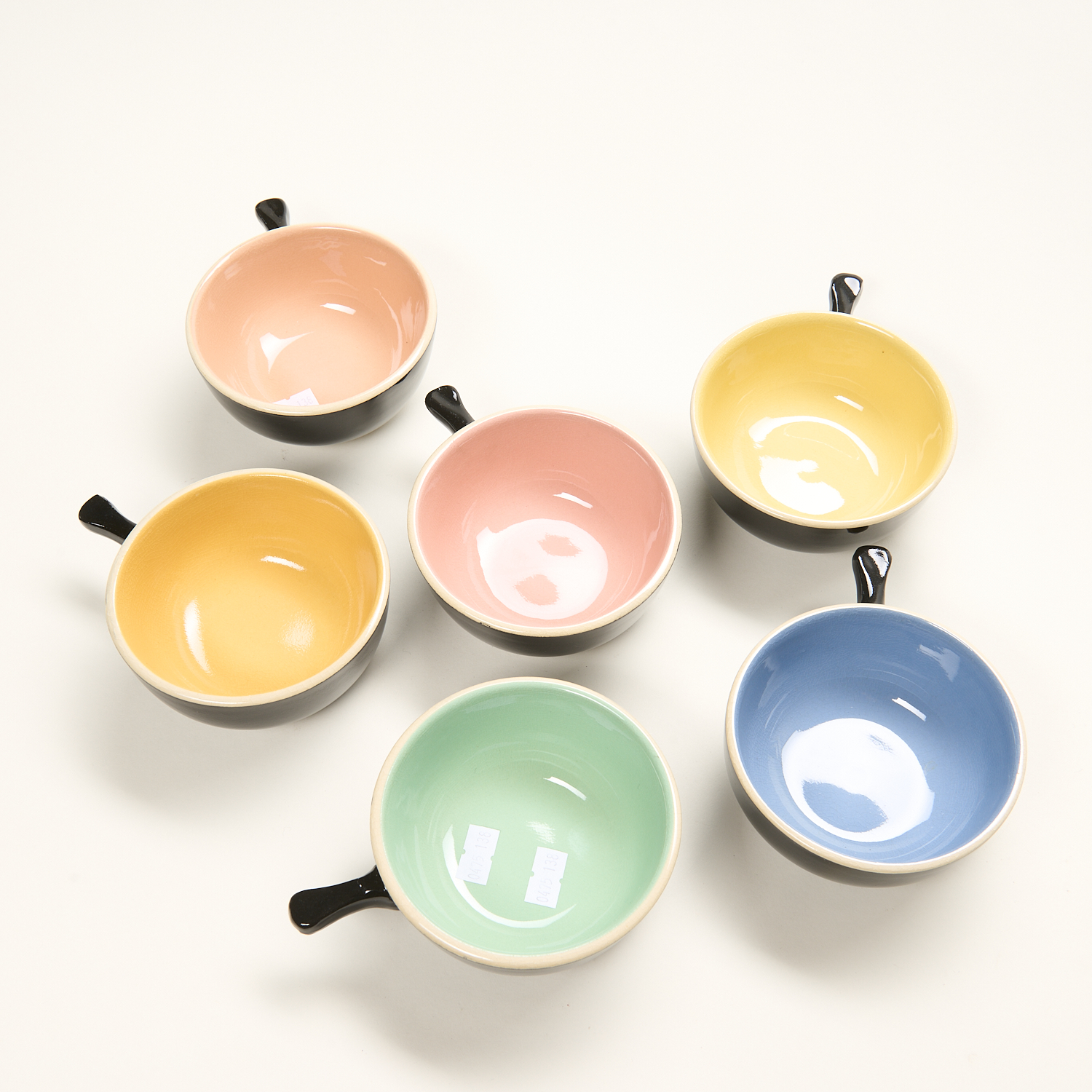 SIX VINTAGE AUSTRALIAN POTTERY HANDLED BOWLS, LEONARD JOEL LOCAL DELIVERY SIZE: SMALL