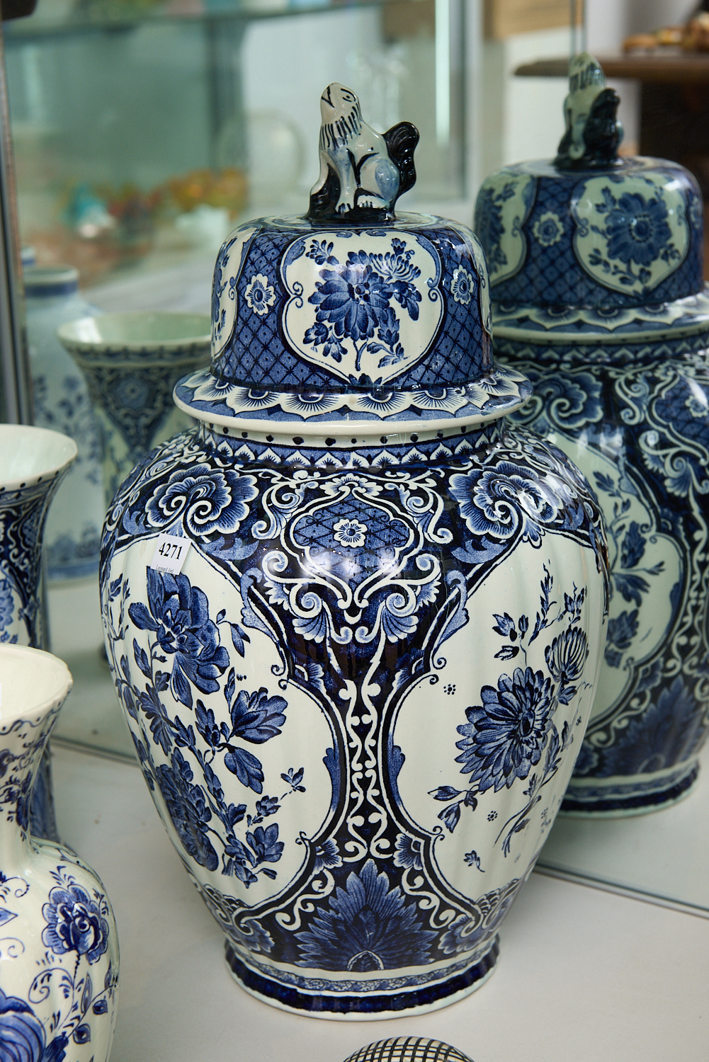 A DELFTS BLUE AND WHITE BOCH SPHINX LIDDED URN WITH FOO LION FINIAL H.49CM, LEONARD JOEL LOCAL DELIVERY SIZE: MEDIUM