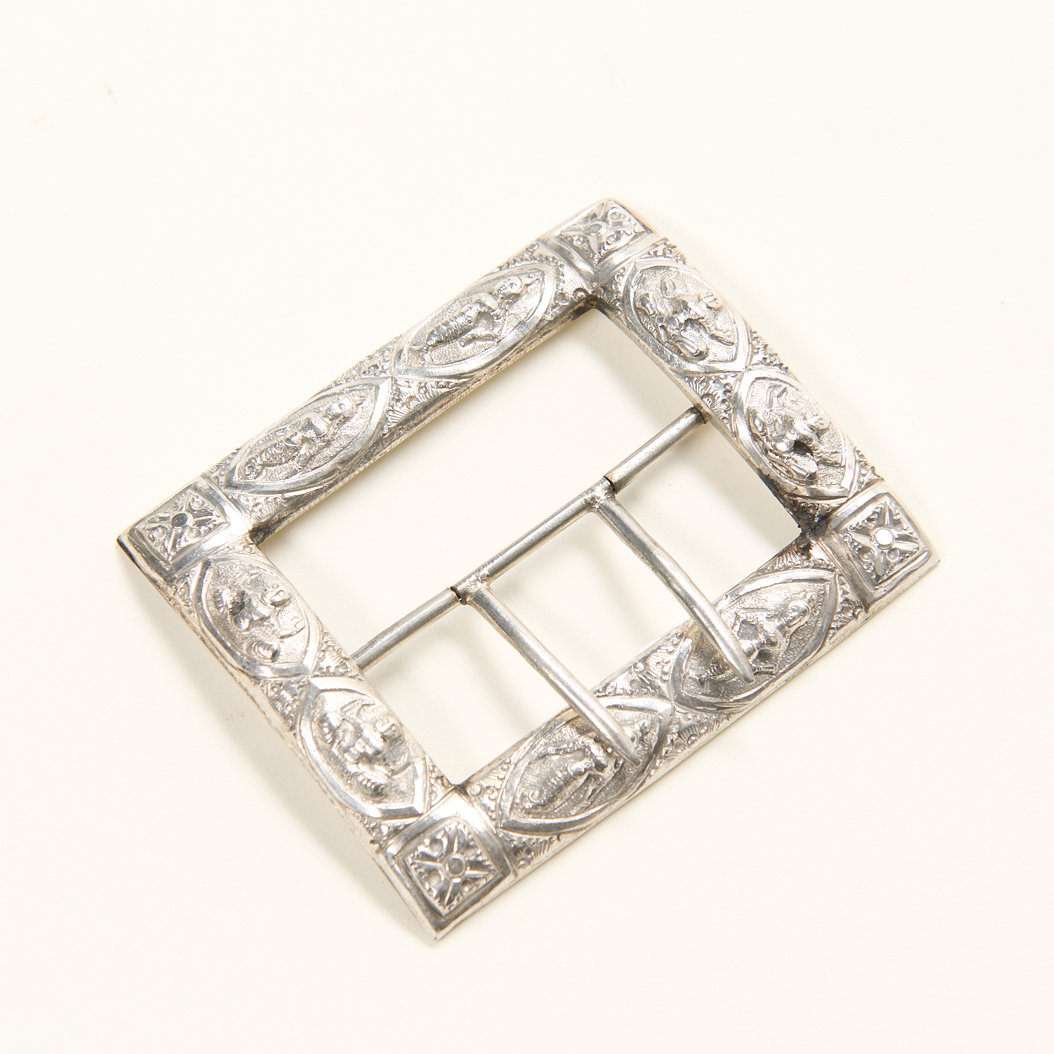 AN INDIAN BUCKLE WITH FIGURAL DECORATION (NO HALLMARKS) - 42 GRAMS H.6CM X W.7.5CM, LEONARD JOEL LOCAL DELIVERY SIZE: SMALL