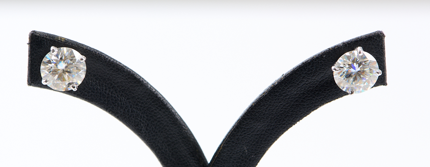 A PAIR OF MOISSANITE SET EARRINGS IN 18CT WHITE GOLD, TO STUD FITTINGS, THE MOISSANITES DIAMETER APPROXIMATELY 9MM AND WEIGHING 5.04CTS