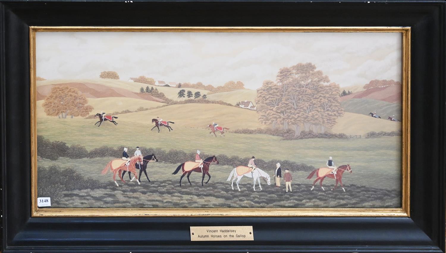VINCENT HADDELSEY, AUTUMN HORSES ON THE GALLOP, REPRODUCTION PRINT, 36 X 75CM, FRAME: 52 X 90CM