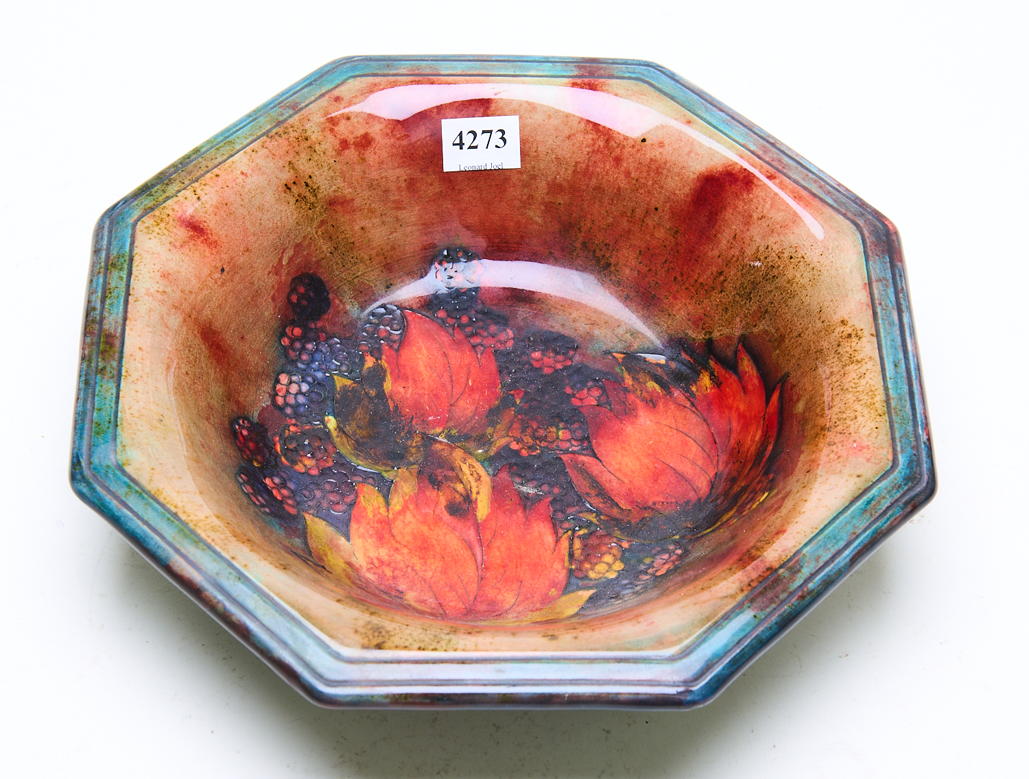 A WILLIAM MOORCROFT OCTAGONAL LEAVES AND BERRIES PATTERN BOWL, CIRCA 1940 (restored) W.25CM, LEONARD JOEL LOCAL DELIVERY SIZE: SMALL