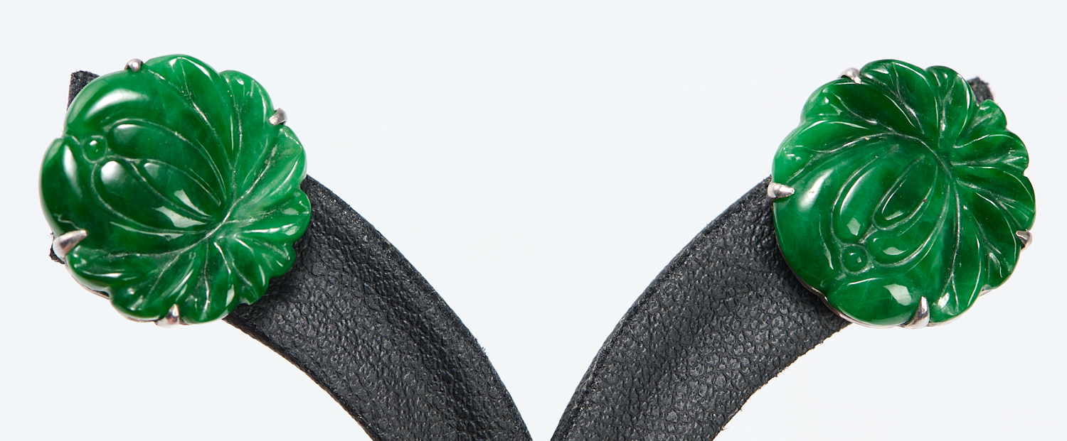 A PAIR OF JADE EARRINGS IN LOW CARAT WHITE GOLD, EACH EARRING COMPRISING A CARVED JADEITE PLAQUE MEASURING 16MM X 16MM, TO POST AND BUTTERFLY FITTINGS
