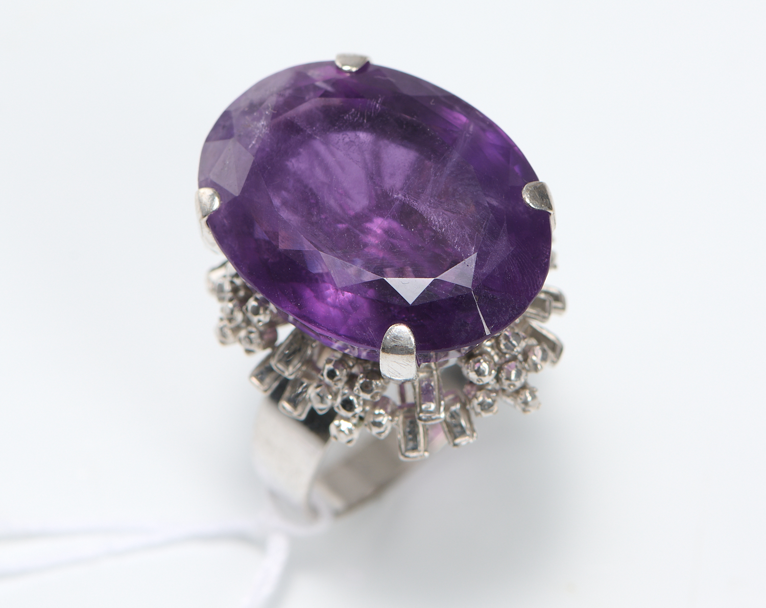 AN AMETHYST RING IN WHITE GOLD PLATED SILVER, CENTRING A CLAW-SET OVAL-CUT AMETHYST WEIGHING APPROXIMATELY 19.00 CARATS, WITHIN A DECORATIVE TEXTURED MOUNT, RING SIZE P