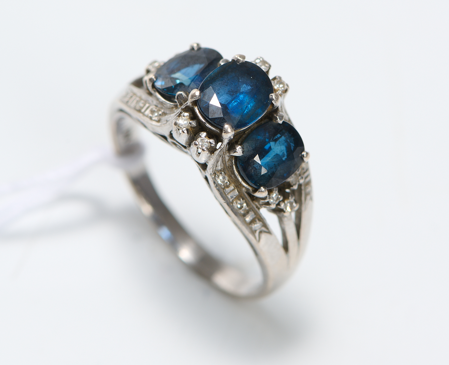 A SAPPHIRE AND DIAMOND SET RING IN LOW CARAT WHITE GOLD, COMPRISING THREE CLAW-SET OVAL-CUT SAPPHIRES TOGETHER WEIGHING APPROXIMATELY 2.80 CARATS, TO A SPLIT SHANK WITH FINE DIAMOND DETAIL, RING SIZE R