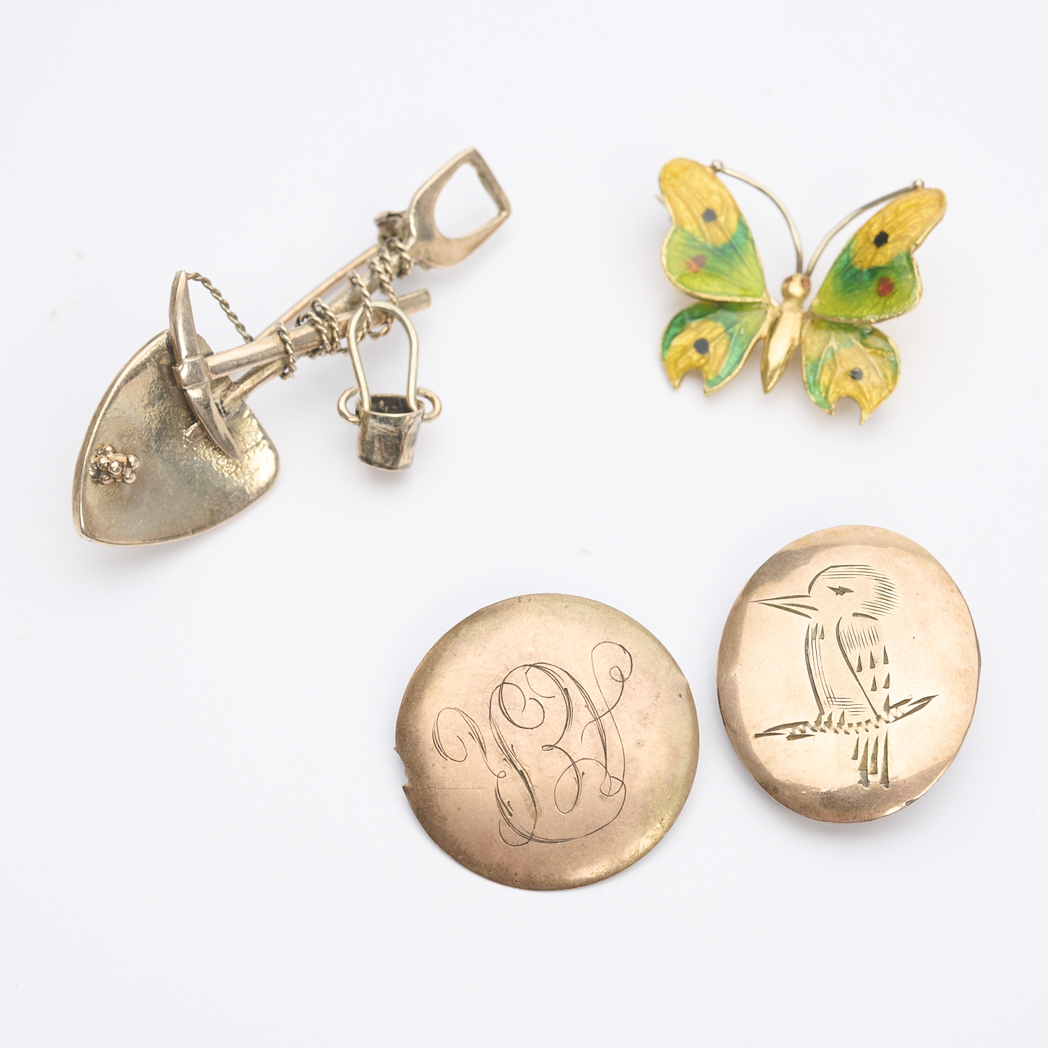 THE CIRCULAR SILVER LINED BROOCH IS MISSING THE PIN HOOK, THE OVAL SILVER LINED BROOCH IS MISSING THE PIN, THE PIN AND ANTENNAE OF THE BUTTERFLY ARE IN SILVER