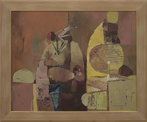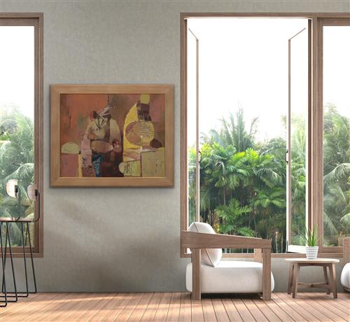 Work in good condition with no major faults to report. Evidence of the top layer of paint splitting, located in the lower mid area of the work (only evident when inspecting close-up). Work is framed with overall size measuring 97 x 118cm.