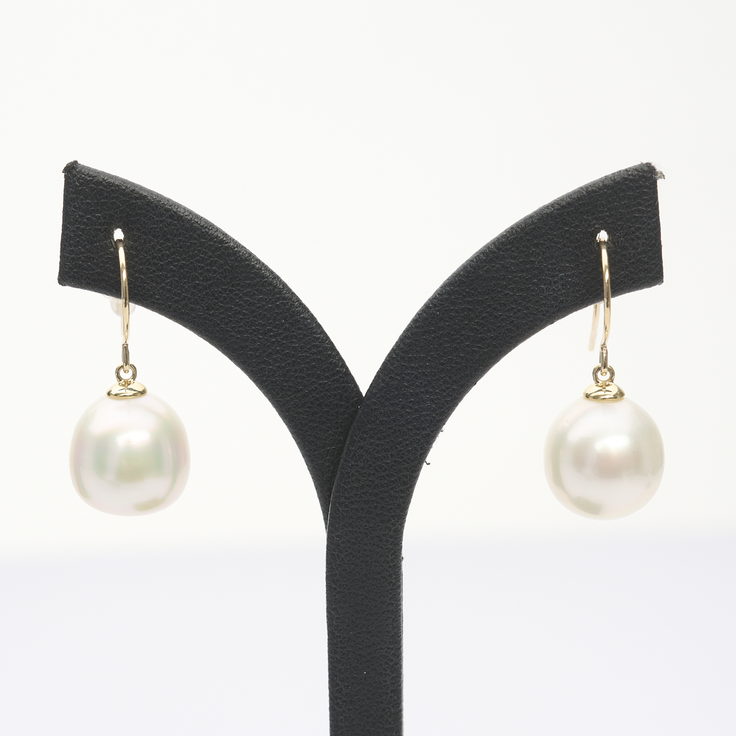 A PAIR OF SOUTH SEA PEARL EARRINGS TO SHEPHERDS HOOK FITTINGS IN 9CT GOLD, THE PEARLS MEASURING APPROXIMATELY 11MM