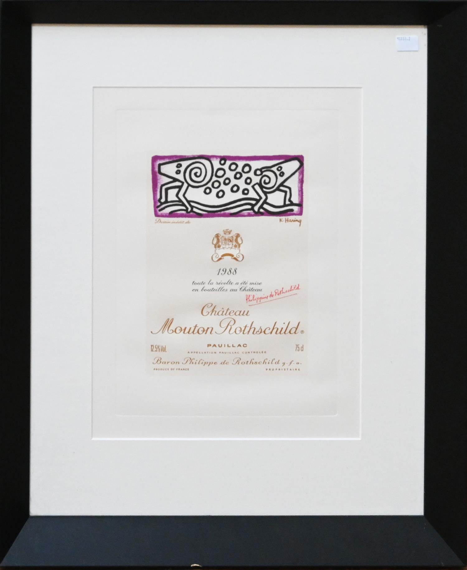 A CERTIFICATE (CHATEAU MOUTON ROTHSCHILD) DEPICTING A KEITH HARING IMAGE, 38 X 29CM