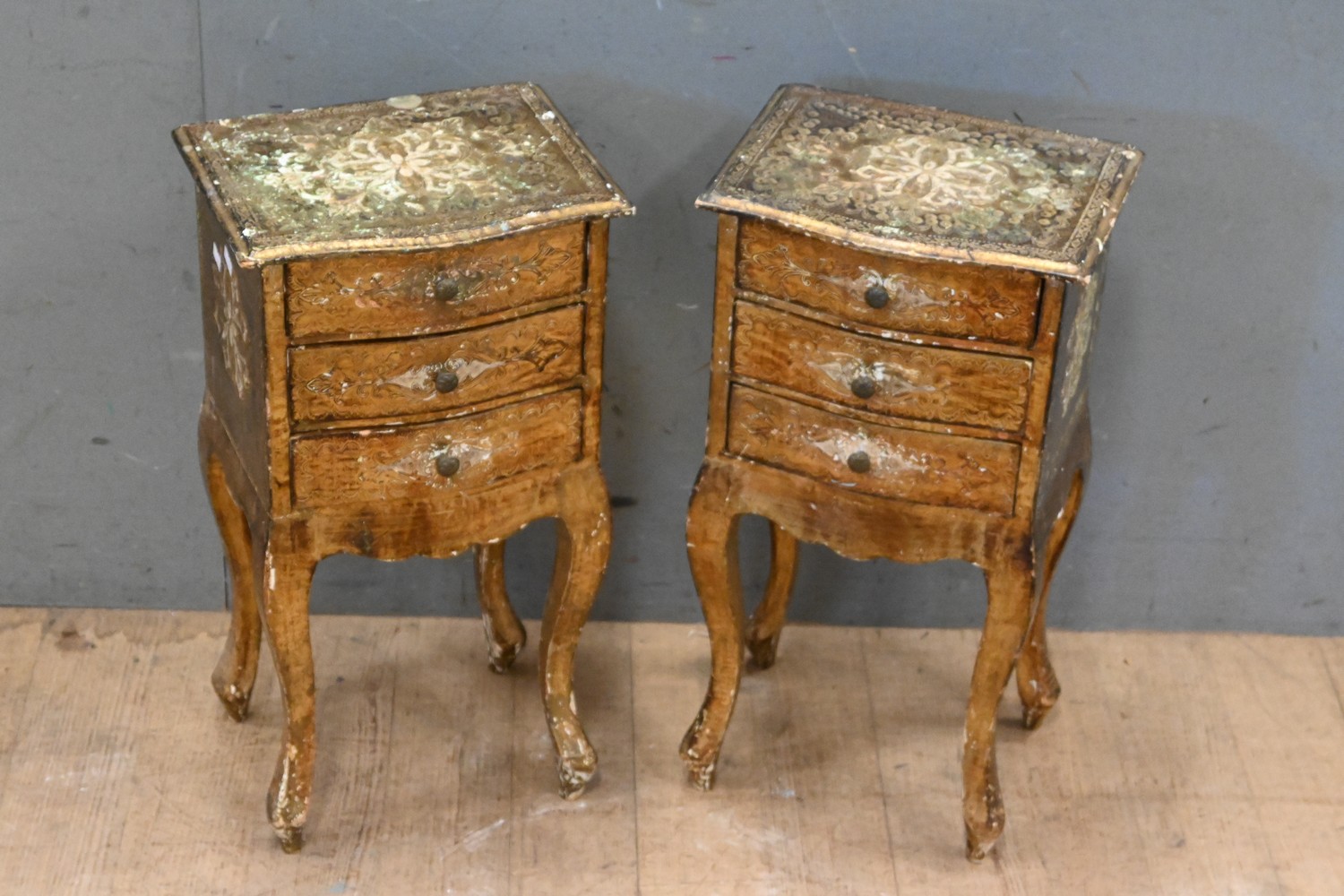 A PAIR OF SMALL FLORENTINE THREE DRAWER BEDSIDES (58H X 30W X 23D CM) (LEONARD JOEL DELIVERY SIZE: MEDIUM)