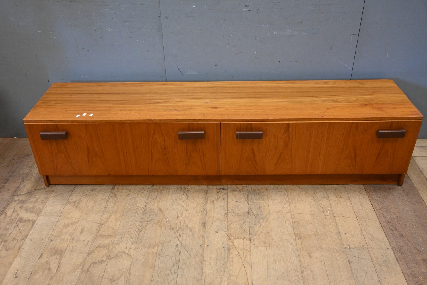 A TEAK LOWLINE CABINET (A/F) ( 44H X 197W X 44D CM) (PLEASE NOTE THIS HEAVY ITEM MUST BE REMOVED BY CARRIERS AT THE CUSTOMER'S EXPENSE. LEONARD JOEL STAFF CANNOT ASSIST CARRYING THIS ITEM) (X-LARGE ITEM)