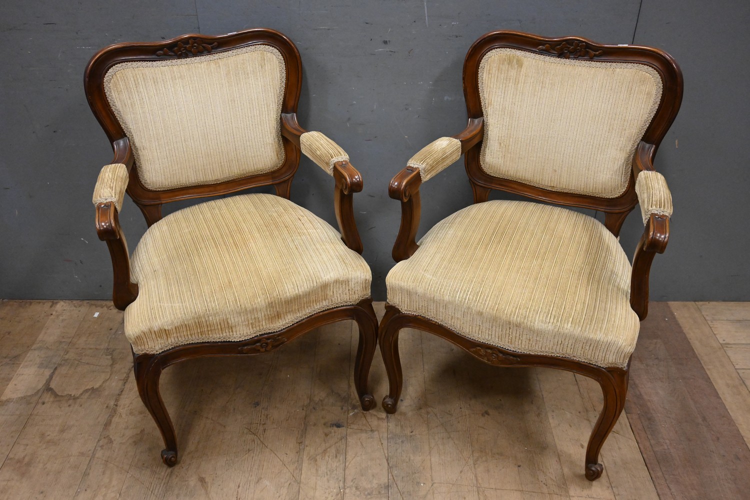 A PAIR OF WALNUT LOUIS XV STYLE FAUTEUILS (H90 X W59 X D51 CM) (LEONARD JOEL DELIVERY SIZE: LARGE)