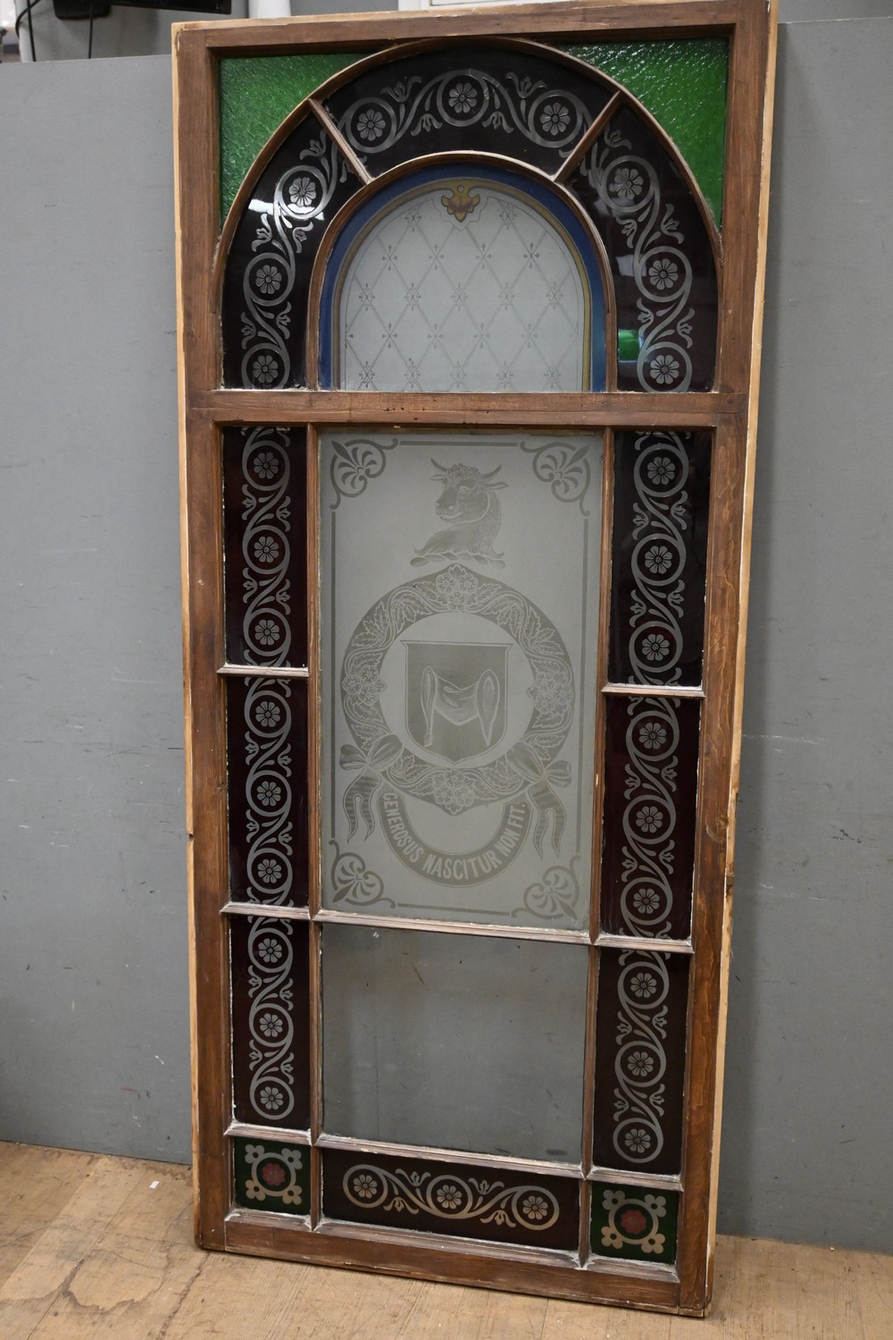 A SCOTTISH STAINED GLASS WINDOW WITH THE WHARTON FAMILY COAT OF ARMS AND MOTTO IN LATIN TRANSLATING TO 'THE GENTLEMAN IS BORN NOT MADE'. (H215 X W95 CM) (PLEASE NOTE THIS HEAVY ITEM MUST BE REMOVED BY CARRIERS AT THE CUSTOMER'S EXPENSE. LEONARD JOEL STAFF CANNOT ASSIST CARRYING THIS ITEM) (X-LARGE ITEM)