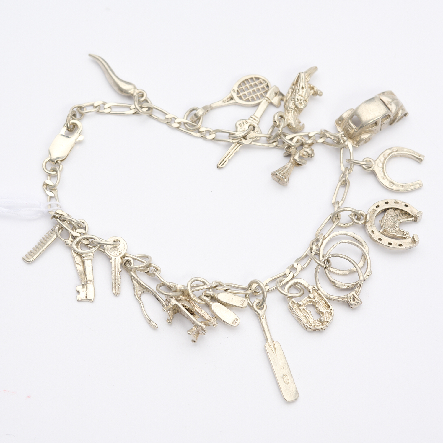 A CHARM BRACELET IN STERLING SILVER, WITH CHARMS INCLUDING A TENNIS RACKET, PARROT, KEY, HORSESHOE, WISH BONE, ANGEL, AND PADLOCK
