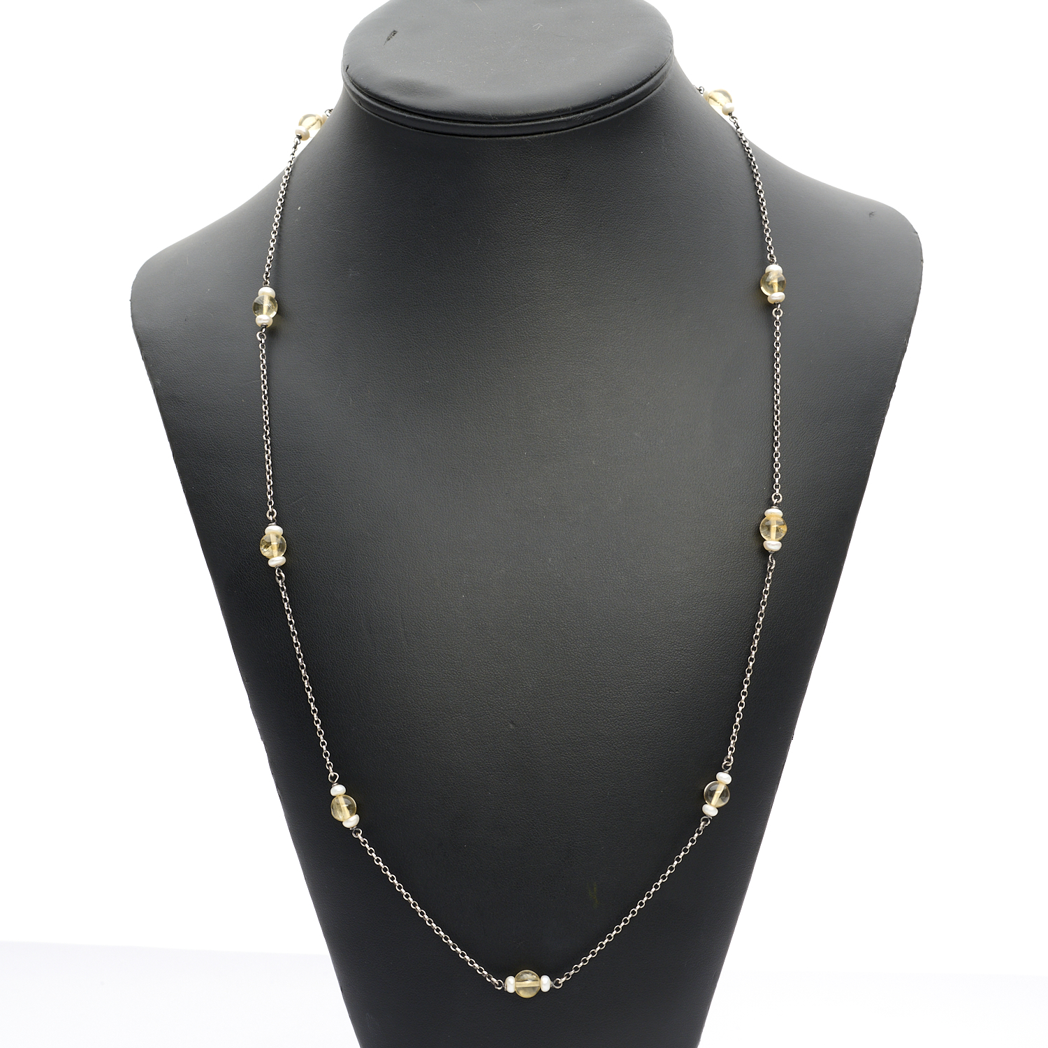 A CITRINE AND PEARL NECKLACE IN STERLING SILVER, TOTAL LENGTH APPROXIMATELY 702MM