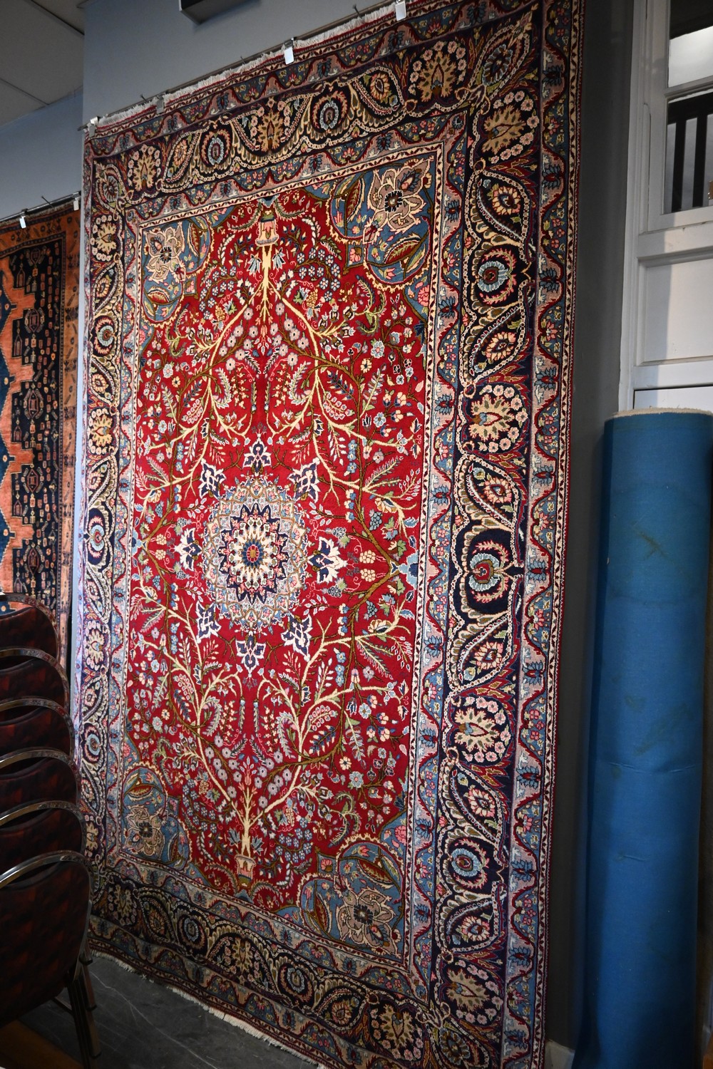 A RARE DOUBLE TREE OF LIFE YAZD CARPET. EX- GALLERY RUG IN PRISTINE CONDITION. COMPRISING OF MOST COLOURFUL & COMPLEX CENTRAL MEDALLION SURROUNDED WITH MULTIPLE TREES OF LIFE IN THE FIELD ALSO HIGHLIGHTED WITH FOUR CORNER MEDALLIONS IN FRENCH BLUE TONES WITH CRIMSON FIELD WITH A DEEP PERSIAN INDIGO BLUE BORDER. THE DESIGN AND COLOUR BALANCE IS WELL EXECUTED WITH FINEST WOOLLEN PILE. FINELY HAND KNOTTED CARPET FROM THE CITY OF YAZD. SIZE: 310 X 200 CM ORIGIN: PERSIA - RRP: $6,500 DOCUMENTATION OF AUTHENTICITY INCLUDED.