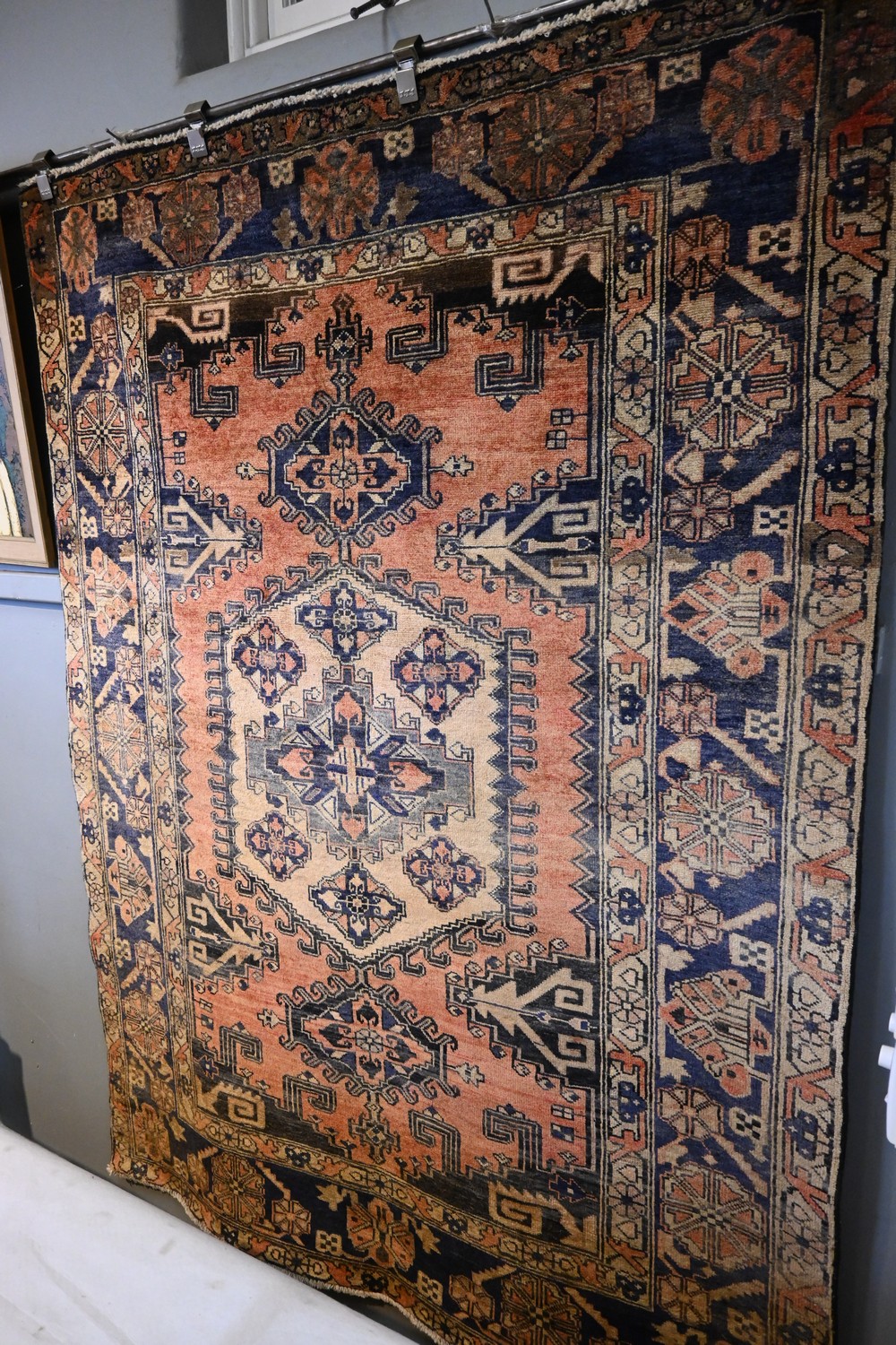 A SUPERB AND RARE VIESS PERSIAN TRIBAL RUG IN SUPERB AND DECORATIVE SUBTLE COLOURS BEING 100% ORGANIC DYES WITH 100% WOOLLEN PILE. COMPRISING OF DISTINGUISHED CENTRAL DIAMOND SHAPE MEDALLION WITH DOUBLE ANCHORED SURROUNDING THE TOP & BOTTOM. WITH A RUSTIC TERRACOTTA FIELD WITH ROYAL BLUE BORDER ALSO IN TONES OF HONEY COMB AND IVORY, EX-GALLERY EXHIBITED CARPET. SIZE: 212 X 165 CM ORIGIN: PERSIA - RRP: $3,600 DOCUMENTATION OF AUTHENTICITY INCLUDED.