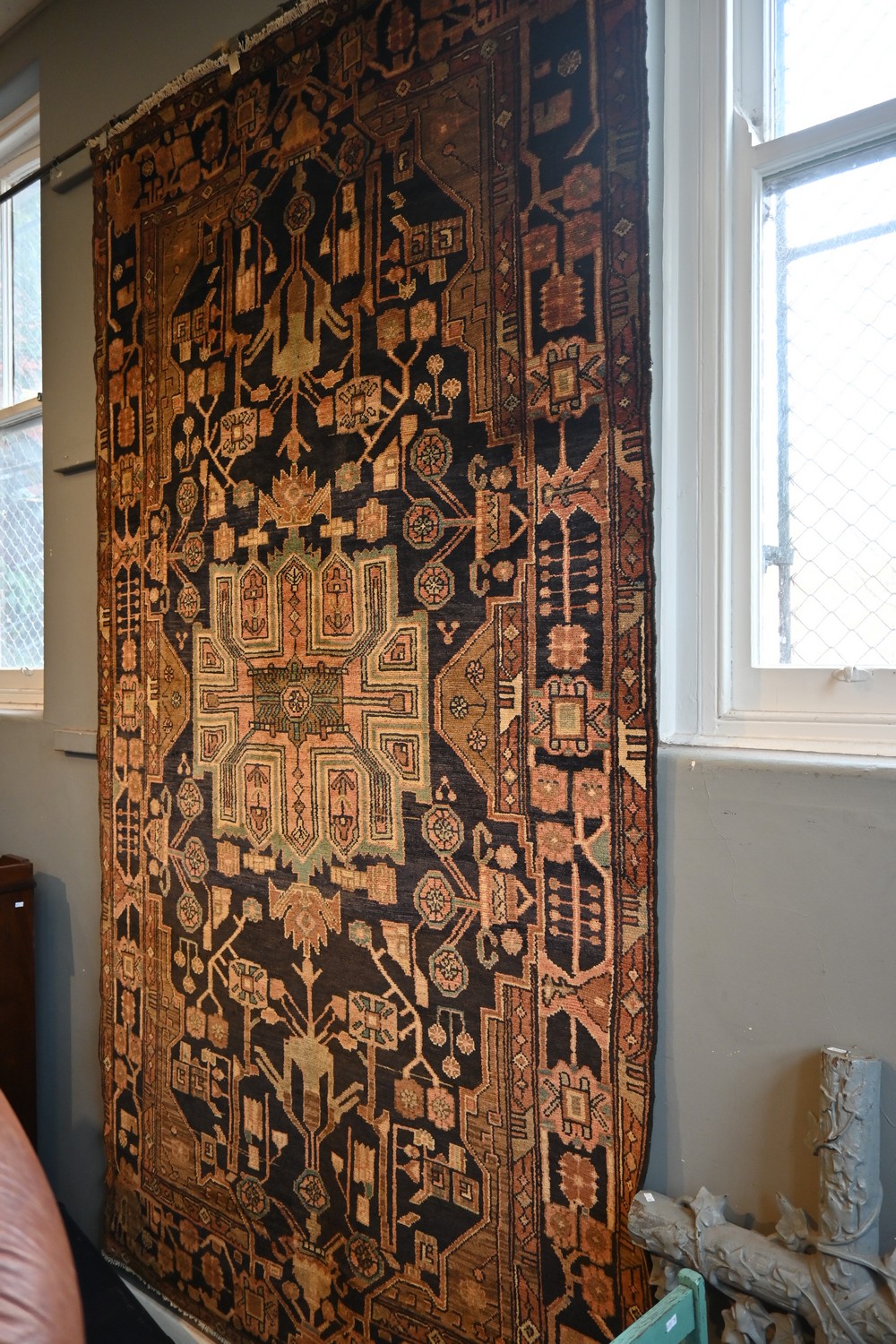 A MAGNIFICENT CIRCA 1950s PERSIAN NAHAVAND RUG. IN CLEAN GALLERY CONDITION WITH 100% SEMI VINTAGE woollen PILE. 100% NATURAL DYES WITH NATURAL ABRASH DISCOLOURATION. FINELY HAND-KNOTTED VILLAGE WEAVE WITH RARE DESIGN OF STYLIZED MEDALLION SET WITHIN A FIELD OF VARYING TRIBAL PATTERNS, URNS BEARING FLORAL SPRAYS. BORDER OF STAR PATTERNS ALSO COMPRISING OF SAGE GREEN AND TERRACOTTA TONES THROUGH OUT THE CENTRAL MEDALLION ALL THE WAY TO THE OUTER BORDER. SIZE: 302 X 166 CM ORIGIN: PERSIA - RRP: $2,900 DOCUMENTATION OF AUTHENTICITY INCLUDED.