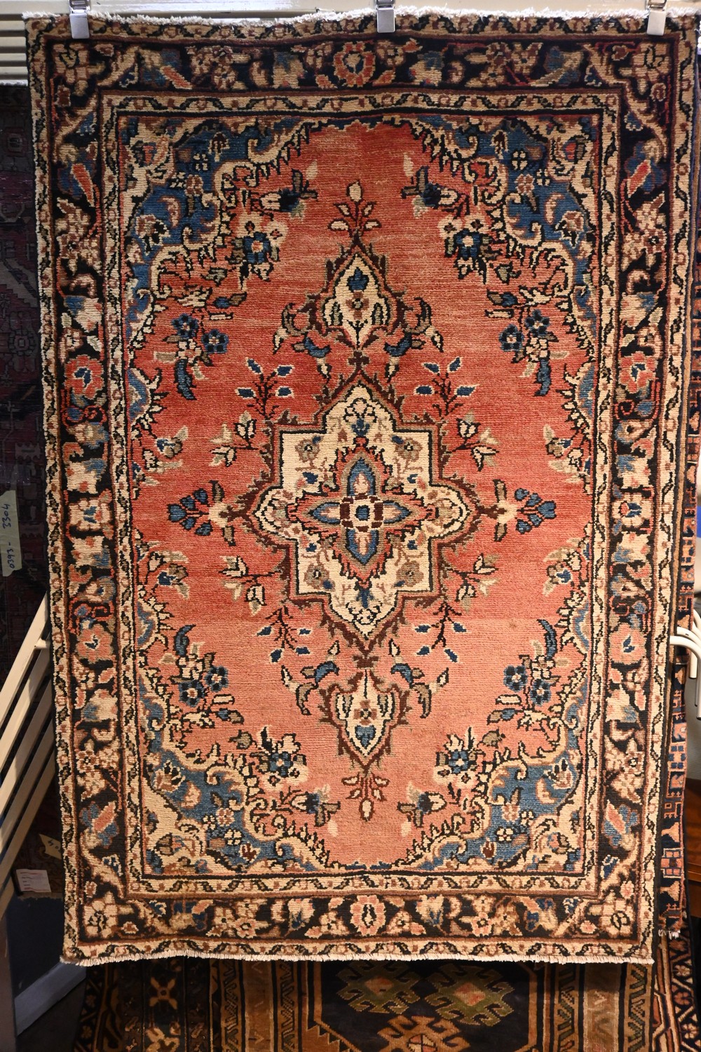 A SEMI TRIBAL PERSIAN MOSHK ABAD RUG. 100% WOOL. NATURAL DYES, DENSE PILE. HAND-KNOTTED VILLAGE WEAVE. SEMI TRIBAL & FLORAL DESIGN OF BOLD MEDALLION CONTAINING AMULETS IN A CORAL FIELD. IN EXCELLENT CONDITION SIZE: 190 X 130 CM ORIGIN: PERSIA - RRP: $950 DOCUMENTATION OF AUTHENTICITY INCLUDED.