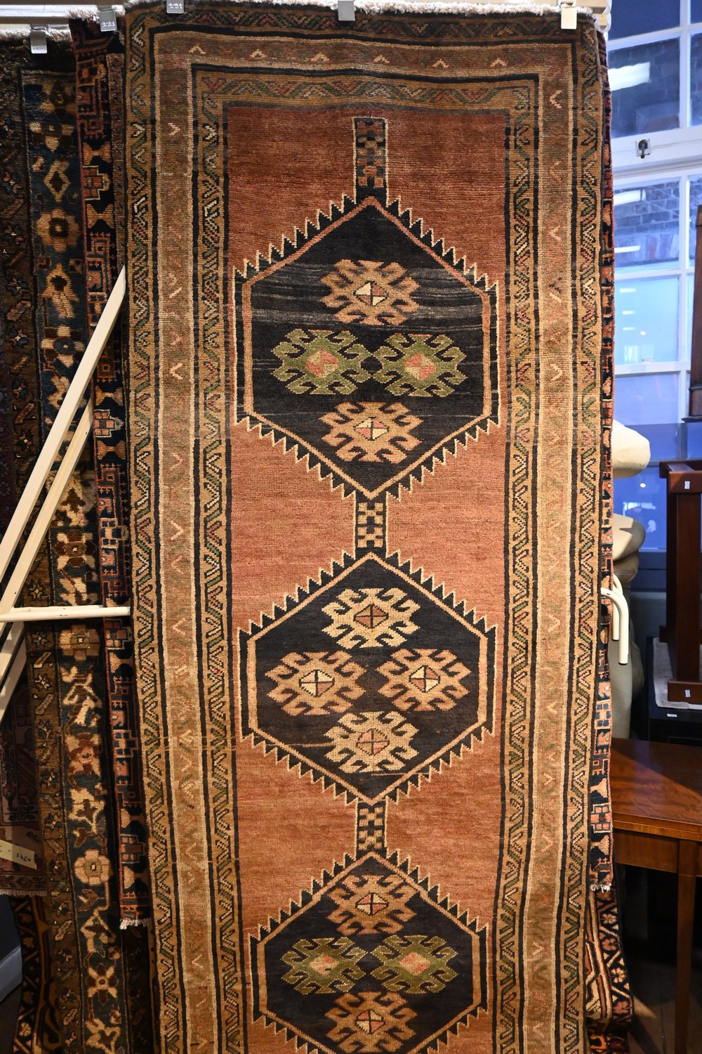 A CIRCA 1960'S TRIBAL PERSIAN LURI HALL RUNNER, 100% WOOL & NATURAL DYES. HAND-KNOTTED TRIBAL WEAVE AND DESIGN OF A UNIQUE TRIPLE POLE MEDALLIONS IN SUBTLE RED TONES & PERSIAN BLUE CONTAINING OF FOUR MINI STARS WITHIN THE DIAMOND MEDALLIONS. WITH FOREST GREEN AND CARAMEL TONES IN BORDER. BEAUTIFUL MELLOW DECORATIVE COLOURS. SIZE: 263 X 100 CM ORIGIN: IRAN - RRP: $1,800 DOCUMENTATION OF AUTHENTICITY INCLUDED