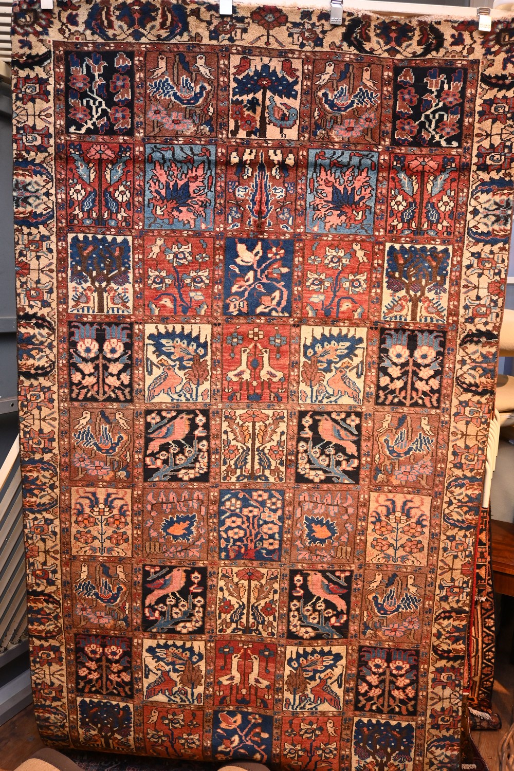 A SUPERFINE PERSIAN GARDEN DESIGN BAKHTIARI RUG IN GALLERY CONDITION. EXTREMELY COLOURFUL WITH FULL OF ANCIENT PERSIAN MOTIFS LIKE PEACOCKS, BIRDS OF PARADISE TREES OF LIFE, 100% EXCELLENT WOOL PILE AND 100% NATURAL DYES AND IS FINELY HAND KNOTTED WITH LUSTROUS SOFT WOOL. SIZE: 293 X 140 CM ORIGIN: KASHAN/PERSIA - RRP: $2,900 DOCUMENTATION OF AUTHENTICITY INCLUDED.