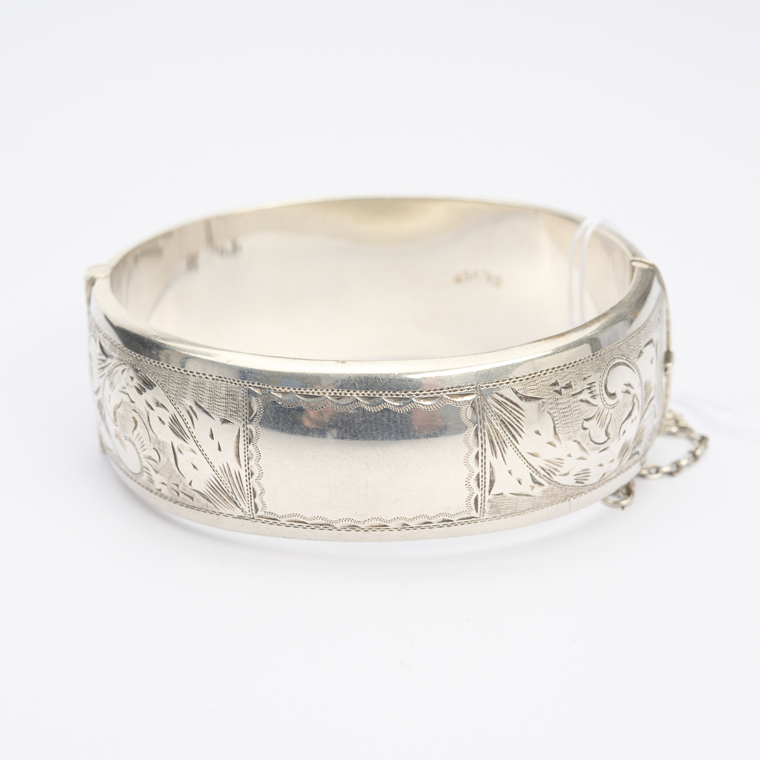 AN ENGRAVED HINGE BANGLE IN STERLING SILVER, INNER DIAMETER APPROXIMATELY 64MM