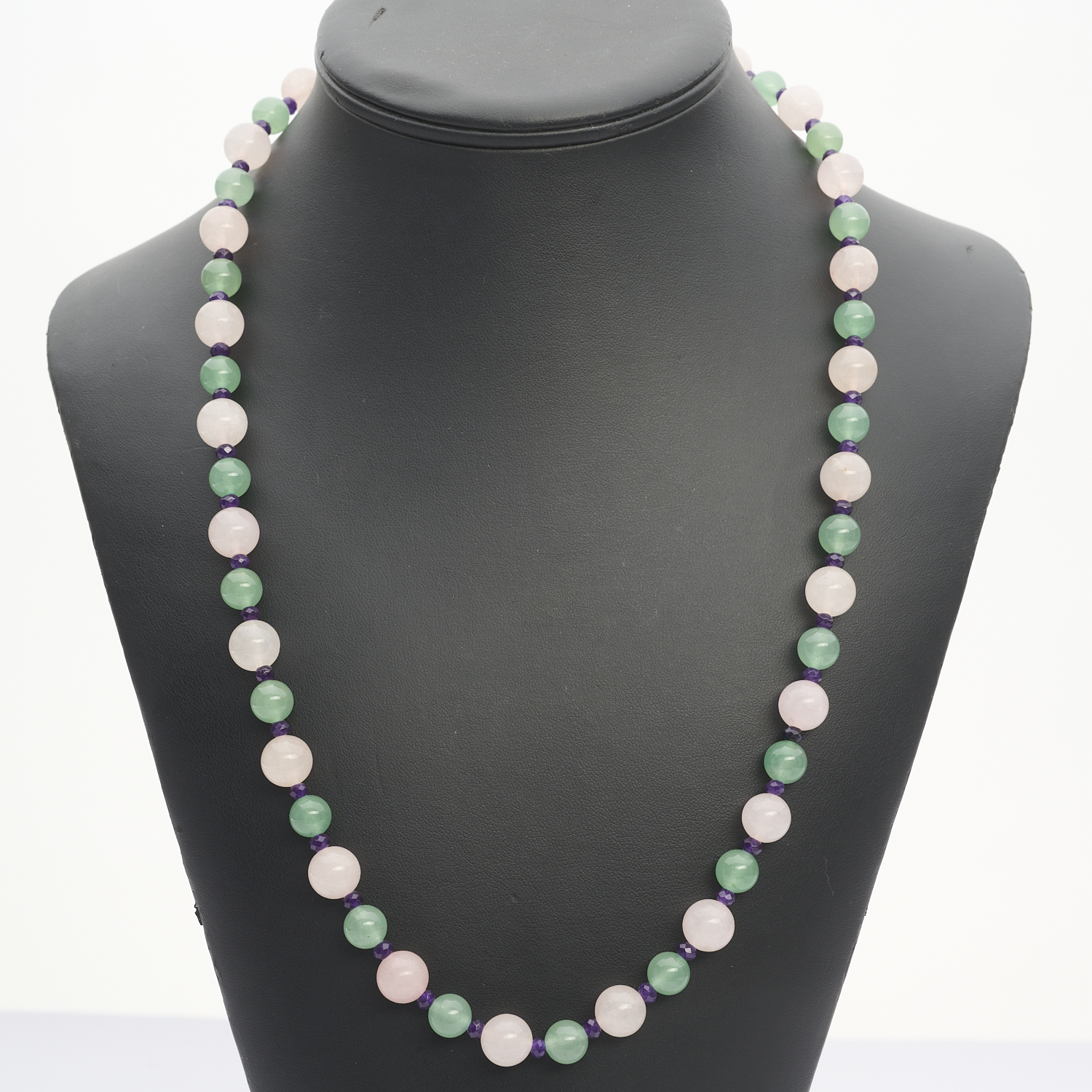 A LONG STRAND OF ROSE QUARTZ AND JADE BEADS, WITH FACETED AMETHYST SPACERS, TO A LOBSTER CLASP