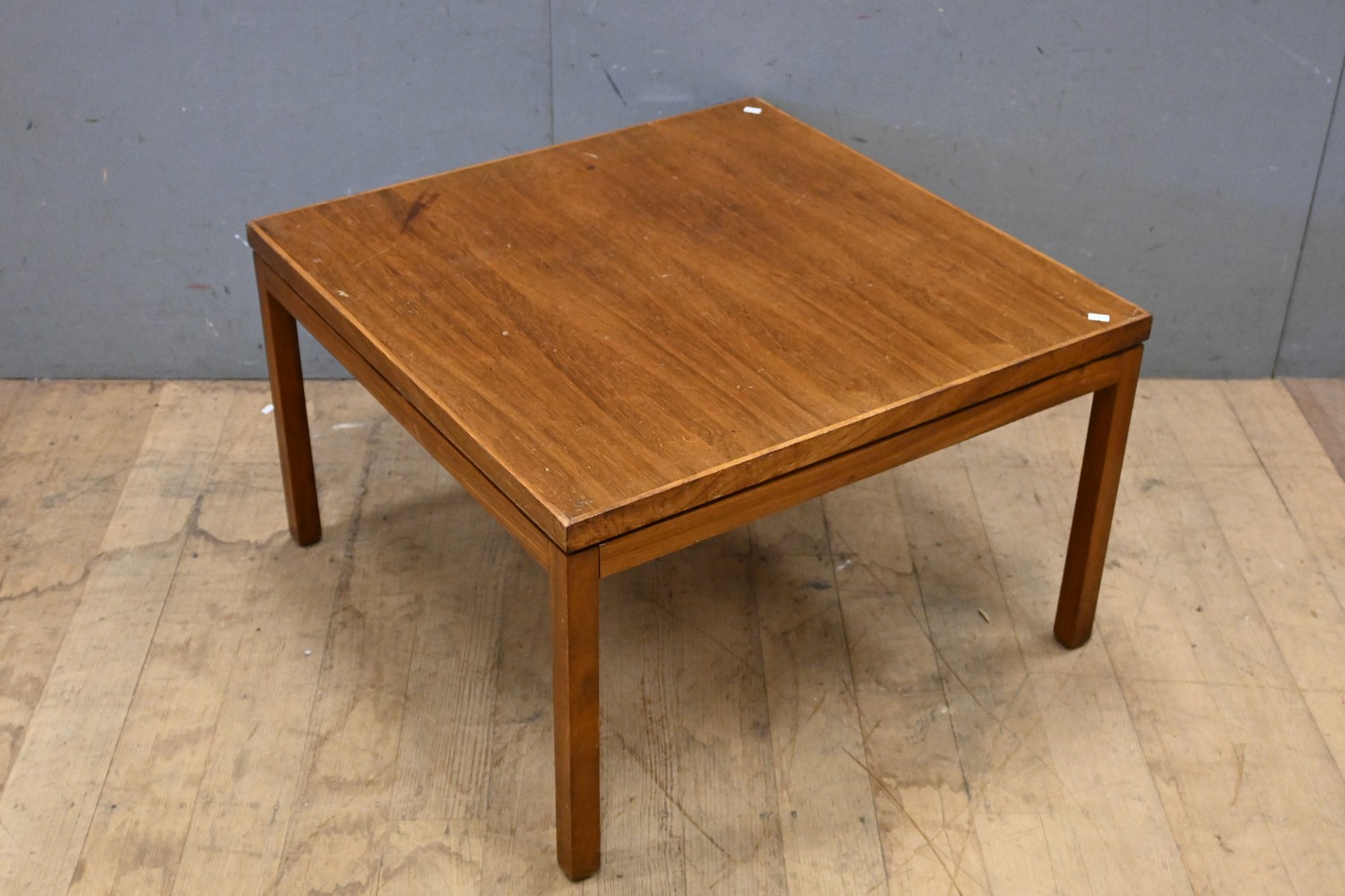 A MID CENTURY TEAK SQUARE COFFEE TABLE (A/F) (H47 X W75 X D75 CM) (LEONARD JOEL DELIVERY SIZE: LARGE)