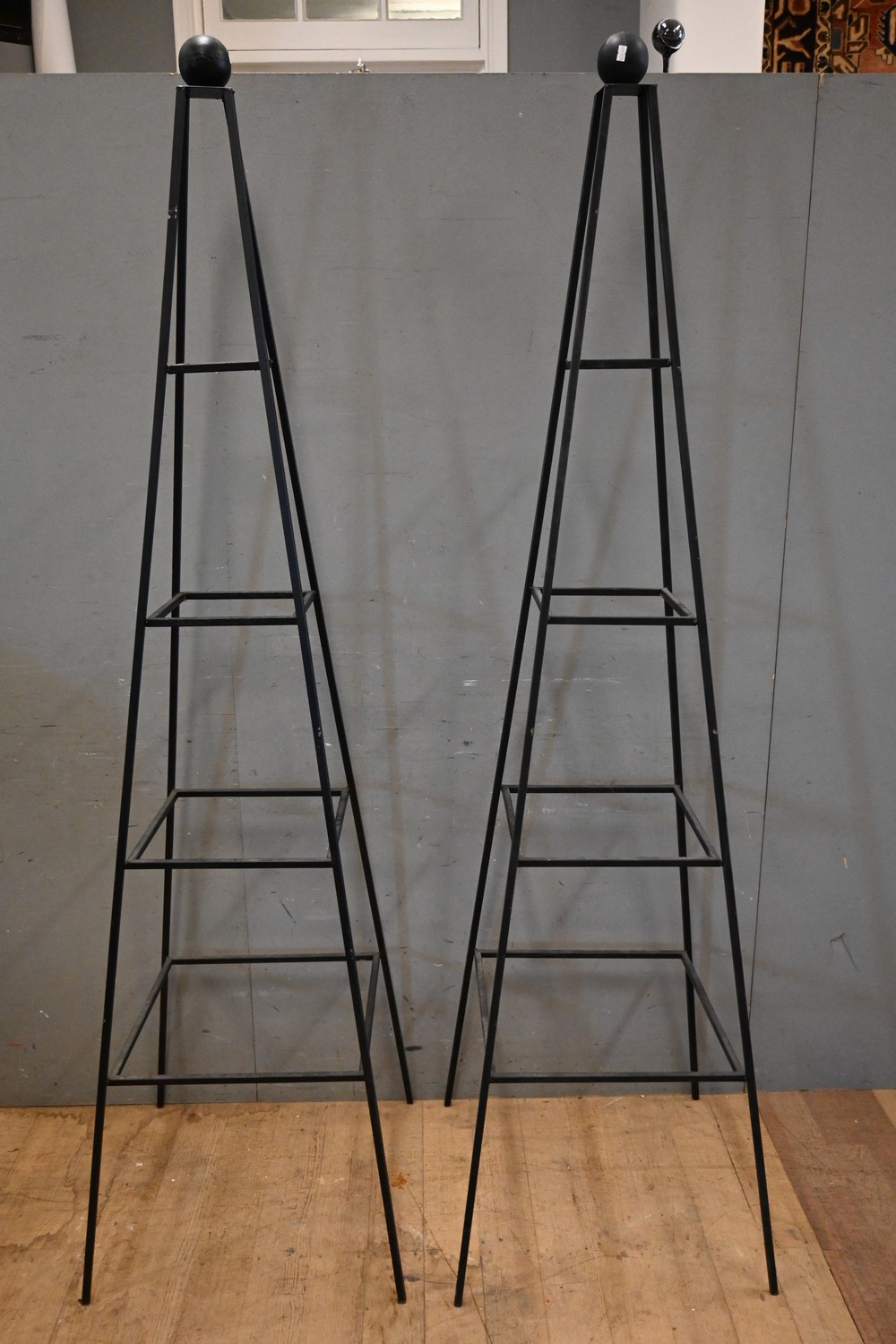 A PAIR OF METAL GARDEN OBELISKS (210H X 58W X 58D CM) (PLEASE NOTE THIS HEAVY ITEM MUST BE REMOVED BY CARRIERS AT THE CUSTOMER'S EXPENSE. LEONARD JOEL STAFF CANNOT ASSIST CARRYING THIS ITEM) (X-LARGE ITEM)